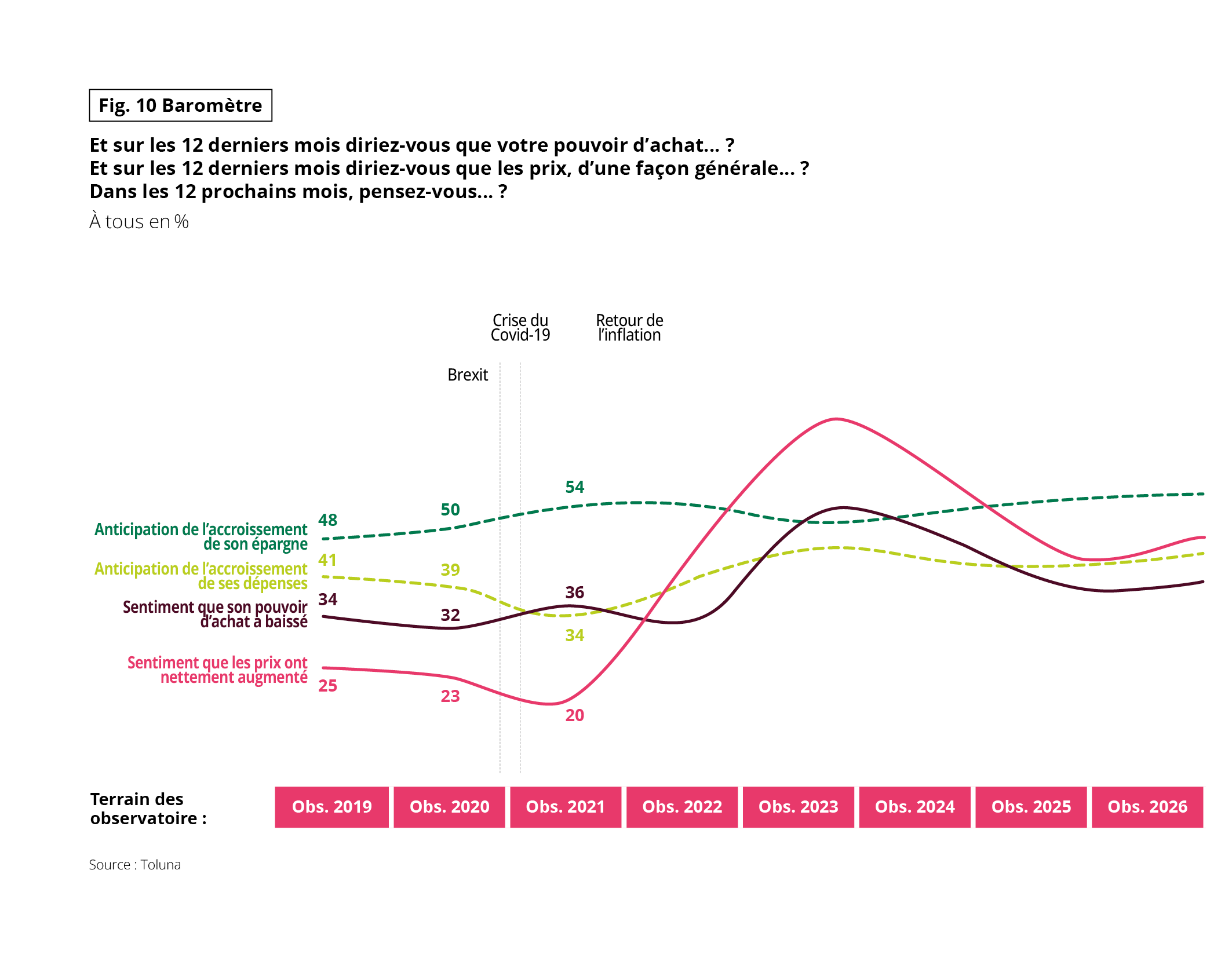 Le graphique retrace l’évolution de plusieurs perceptions économiques exprimées en pourcentage, entre 2019 et 2026. Graphique en courbes multiples. Chaque courbe correspond à un indicateur. Les repères « Brexit », « Crise du Covid-19 » et « Retour de l’inflation » sont des annotations contextuelles.