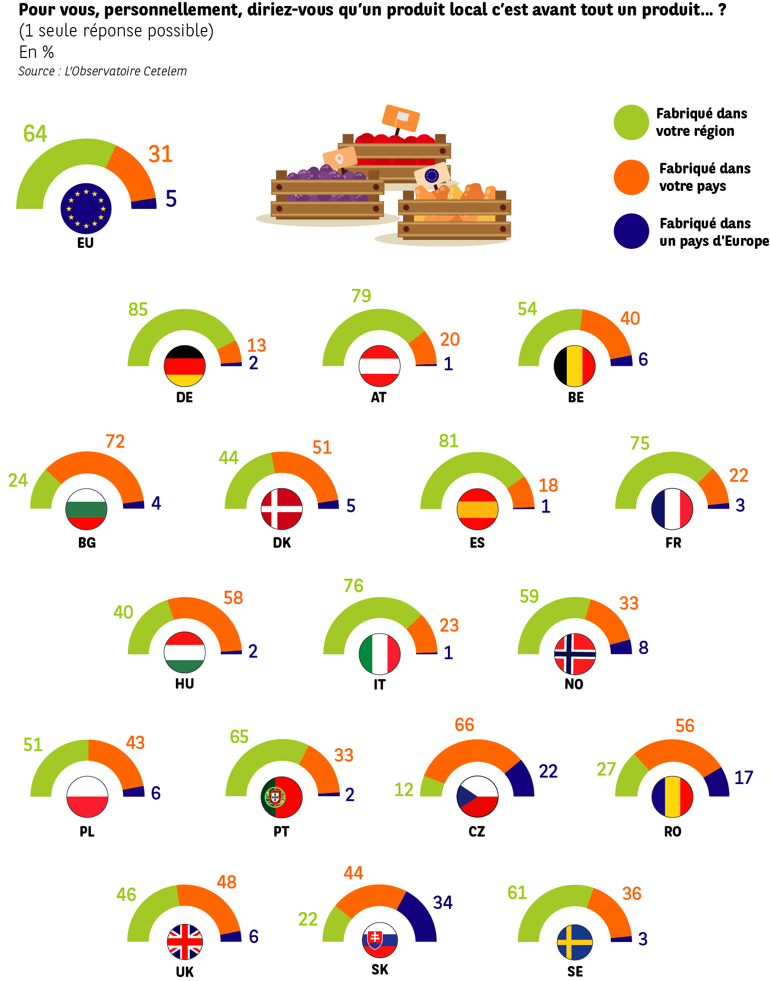 En moyenne, 64 % considèrent qu’il s’agit d’un produit fabriqué dans la région où ils vivent. 31 % estiment que local rime avec national. Seulement 5 % lui attribuent une dimension européenne, invitant à prendre avec modestie la notion de marché unique.