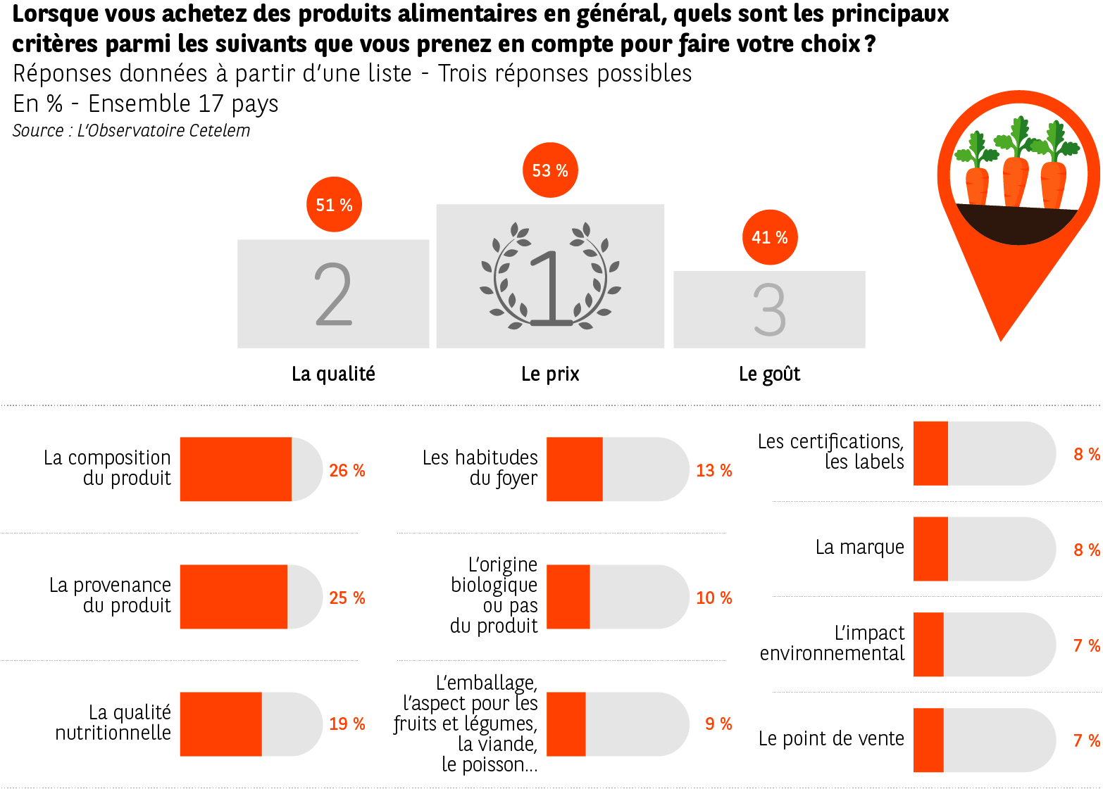Dans le domaine de l’alimentation, la prépondérance du rapport prix-qualité est la moins forte (respectivement 53 % et 51 %), d’autres critères entrant en ligne de compte dans le choix des consommateurs (composition 26 %, provenance 25 % et qualité nutritionnelle 19 %). Tous les pays placent le prix, la qualité et le goût dans leur tiercé de choix, à l’exception des Italiens pour lesquels la qualité des produits alimentaires, leur provenance et seulement ensuite le prix sont déterminants (52 %, 42 % et 36 %). En Allemagne, en Roumanie et en Bulgarie, la qualité prime sur le prix comme premier critère de choix.