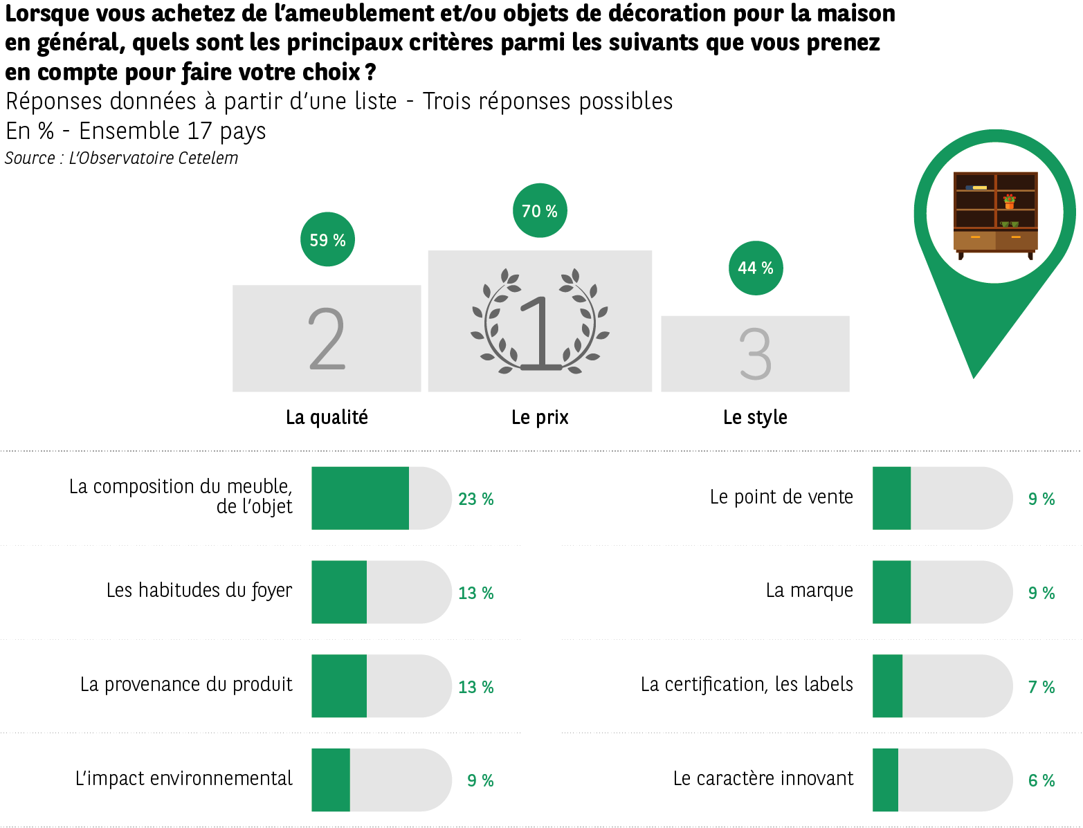 Dans les autres secteurs, prix et qualité forment un duo solide de prescription avec systématiquement un troisième critère qui émerge de façon nette. En ameublement, le style recueille 44 % des avis contre 70 % et 59 % pour le prix et la qualité.