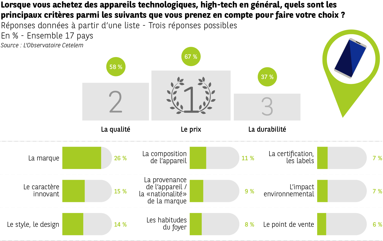 Pour les appareils technologiques, la durabilité s’impose comme challenger (37 %, vs 67 % et 58 %).