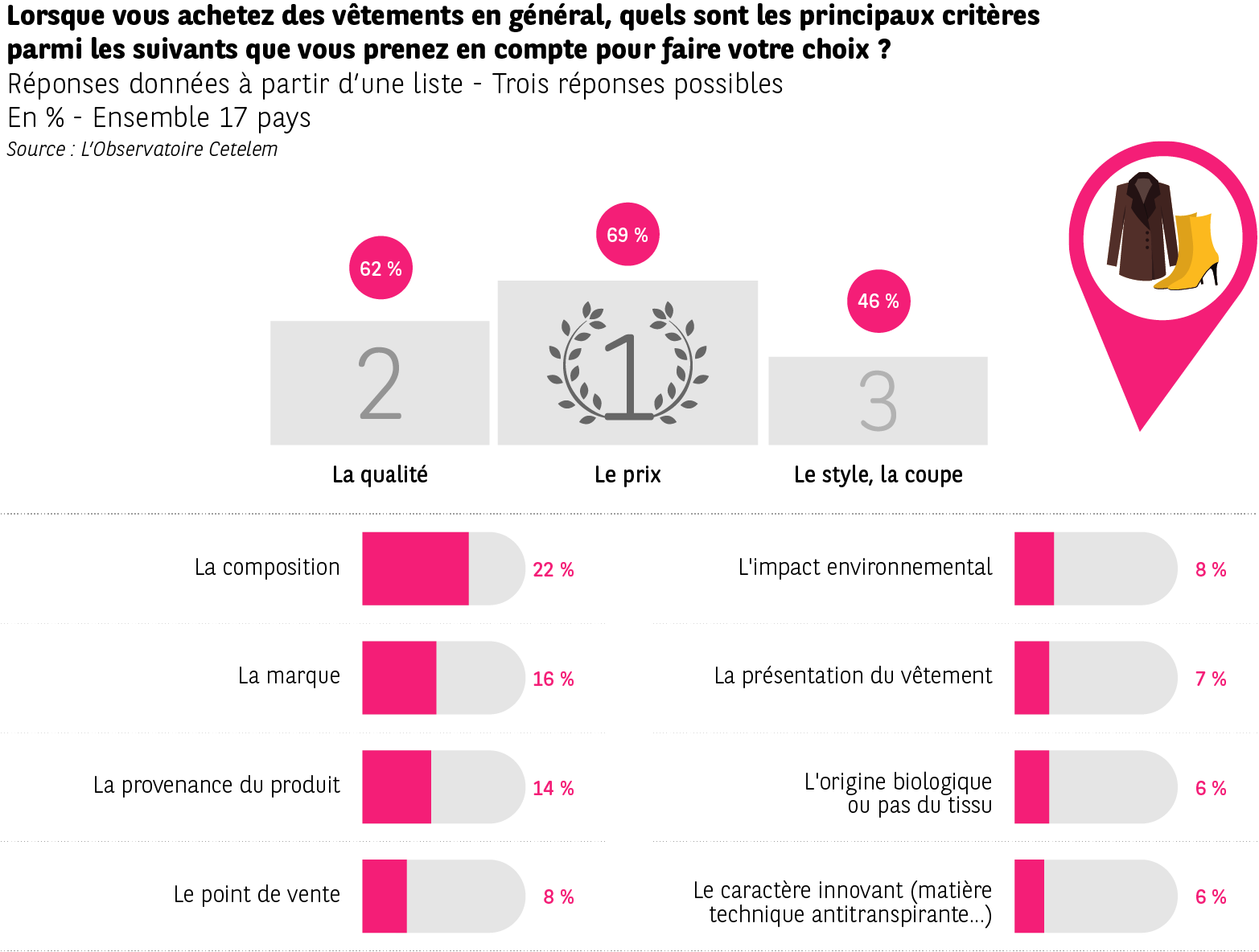 Le style et la coupe occupent la troisième marche du podium quand il s’agit de choisir un vêtement (46 % vs 69 % et 62 %).