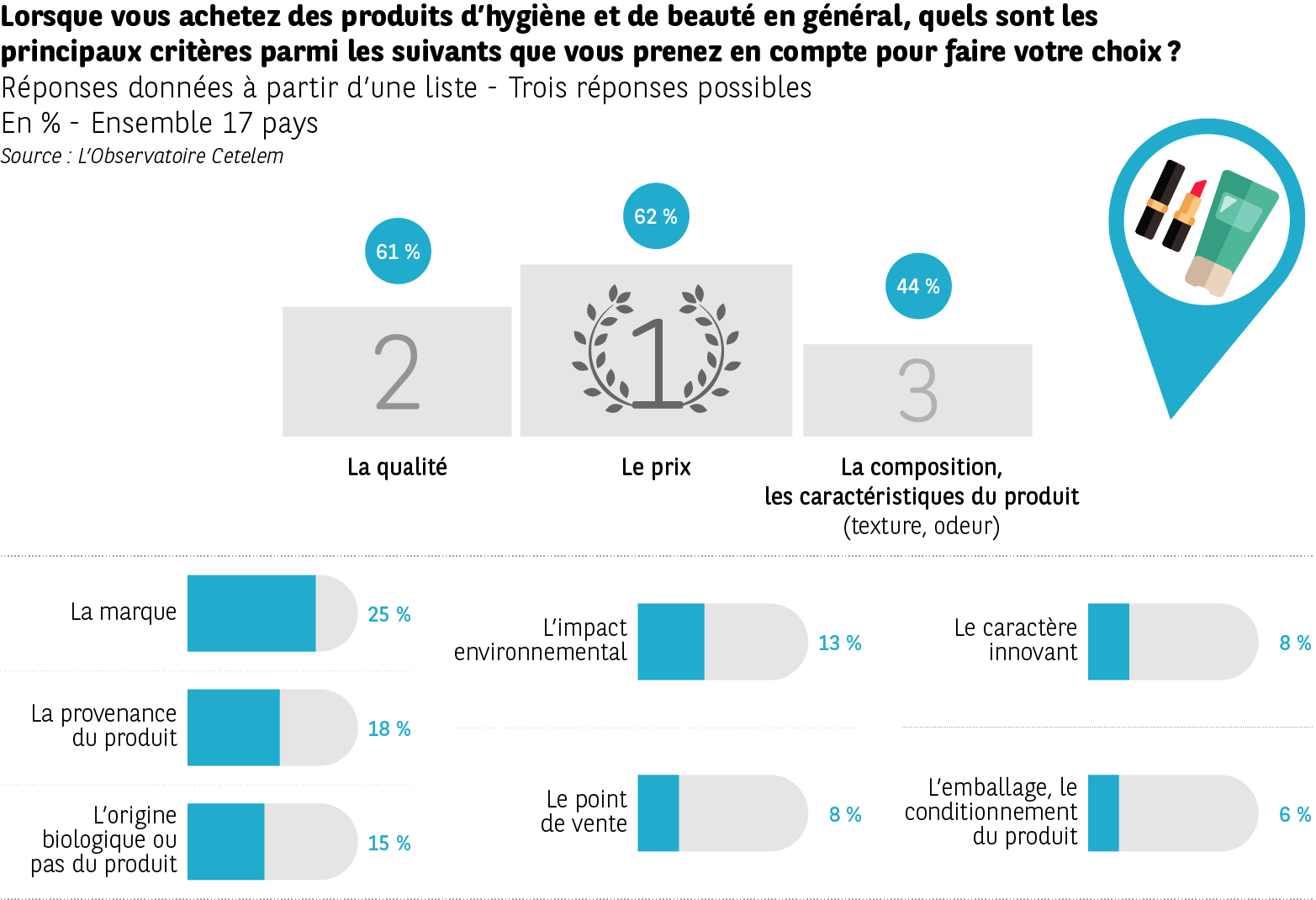 Et en ce qui concerne les produits de beauté, composition et caractéristiques du produit enregistrent 44 % des opinions (62 % et 61 % pour le prix et la qualité).