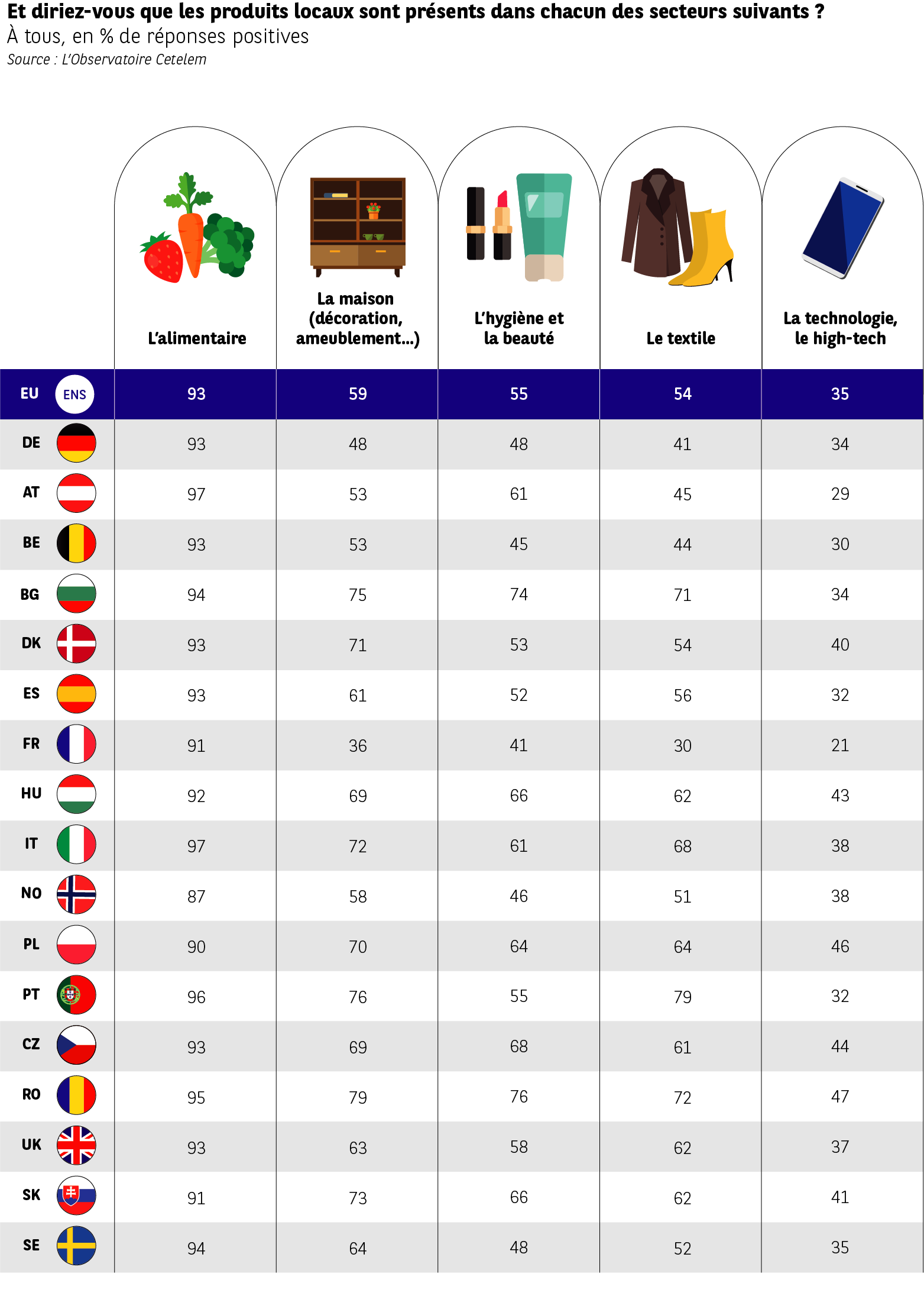 Concernant l’alimentaire, il n’y a pas débat. 93 % des Européens constatent la présence de produits locaux, les différences étant peu marquées d’un pays à l’autre.