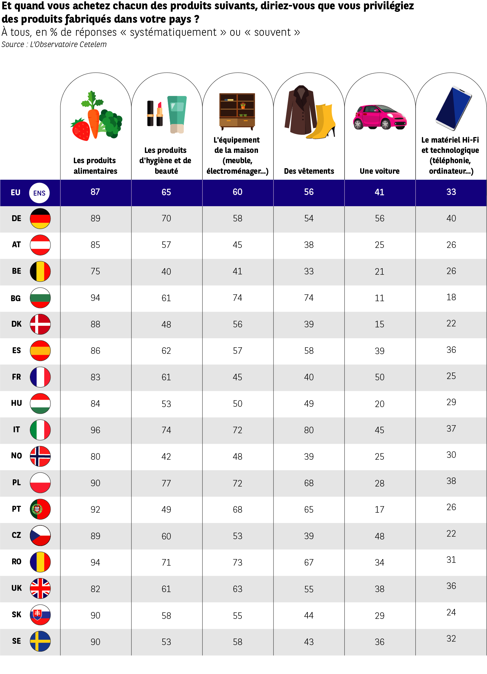 Le domaine de la technologie et de la high-tech figure toujours au dernier rang avec seulement 33 % de consommateurs qui privilégient l’achat de produits locaux. Il est précédé par le secteur automobile où la préférence locale séduit 41 % des Européens. Une préférence d’autant plus grande que les pays concernés accueillent des constructeurs et des marques puissantes. L’Allemagne et la France occupent ainsi les deux premières positions avec 56 % et 50 %.