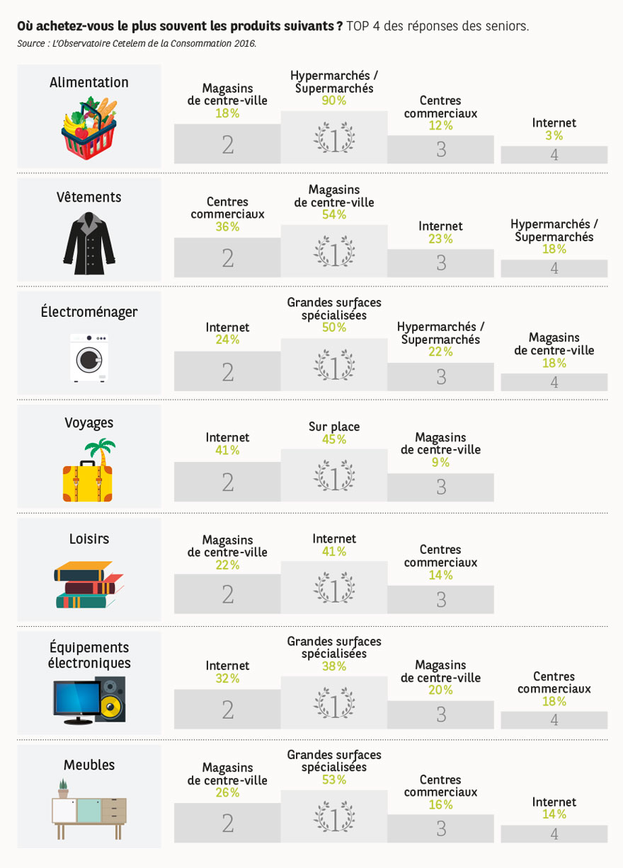 Pour les seniors, les magasins restent un lieu de consommation incontournable, choisi pour la plupart des produits. Ils devancent même largement les canaux digitaux pour les achats de produits alimentaires, d’électroménager et de meubles.