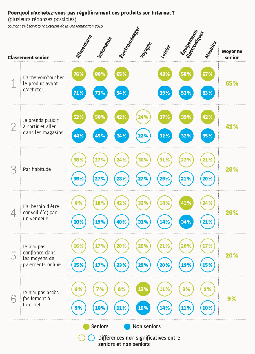 En moyenne, lorsqu’ils n’achètent pas sur Internet, 26 % des seniors européens le justifient par le besoin d’être conseillé par un vendeur. C’est particulièrement sensible pour l’achat d’équipements électroniques (41 % des seniors évitent ce type d’achat en ligne pour cette raison contre 34 % des moins de 50 ans).
