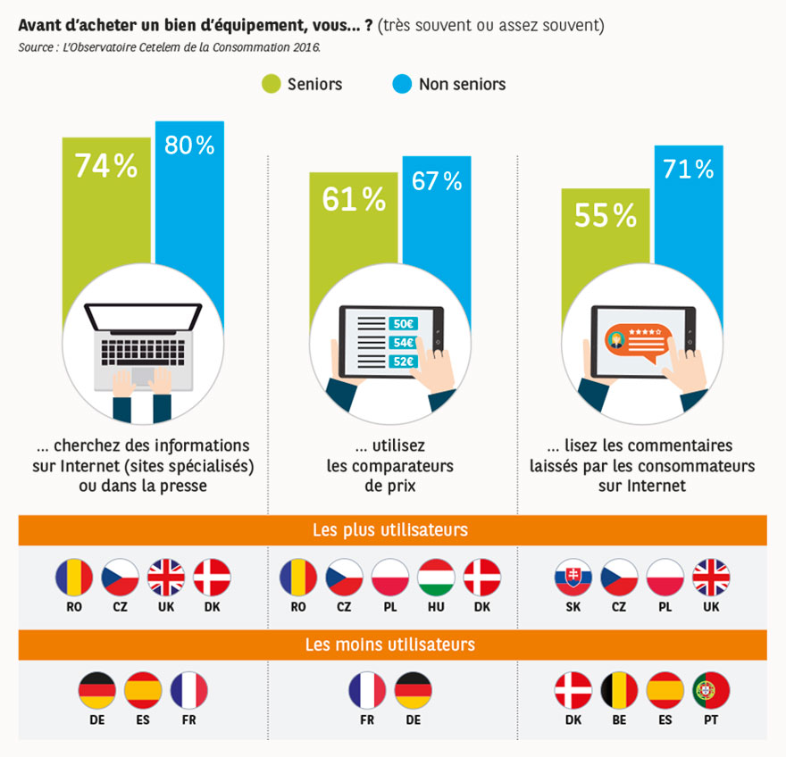 40 % des seniors se décrivent avant tout comme des internautes « utilitaires ». Ils choisissent Internet comme principale source d’information consumériste. Comparateurs en ligne, avis d’internautes, sites de consommateurs, fiches produits détaillées… ils y trouvent une multitude d’informations complémentaires pour être guidés dans l’achat d’un produit, quitte à se déplacer par la suite en magasin pour finaliser leur transaction. Les comparateurs ont leurs faveurs pour leur facilité d’utilisation ; ils leur permettent d’obtenir l’essentiel des informations en peu de temps.
