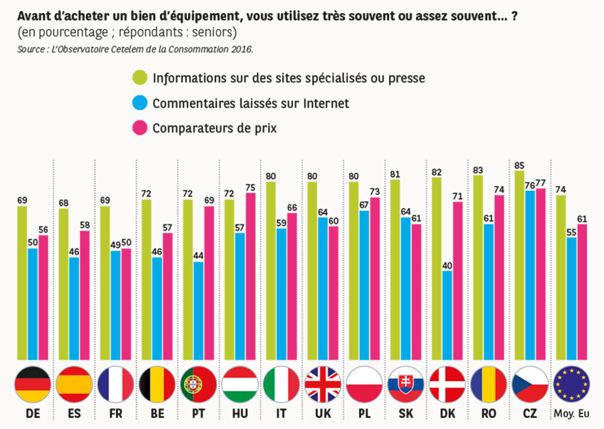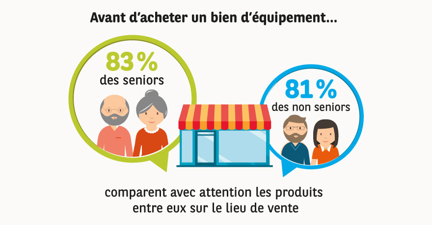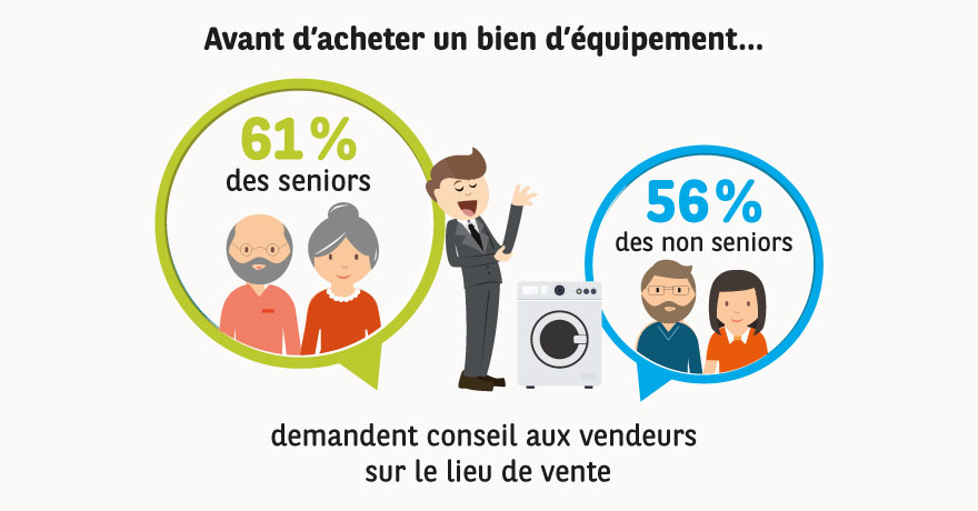 En plus de comparer attentivement les produits entre eux, plus de 60 % des seniors européens demandent conseil aux vendeurs sur le lieu de vente avant d’acheter un bien d’équipement, soit 5 points de plus que les moins de 50 ans. Cette attitude est plutôt féminine, les femmes de plus de 50 ans disant avoir besoin de ces conseils dans deux tiers des cas.