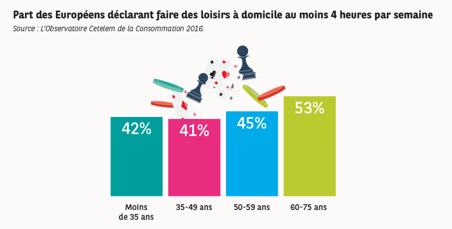 Les loisirs à domicile sont également plébiscités par les seniors : lecture, mots croisés, jeux de société, de réflexion ou de mémorisation. Ils y consacrent en moyenne 6h30 chaque semaine, une heure de plus que les plus jeunes, avec des Britanniques qui y succombent même plus de 8h !