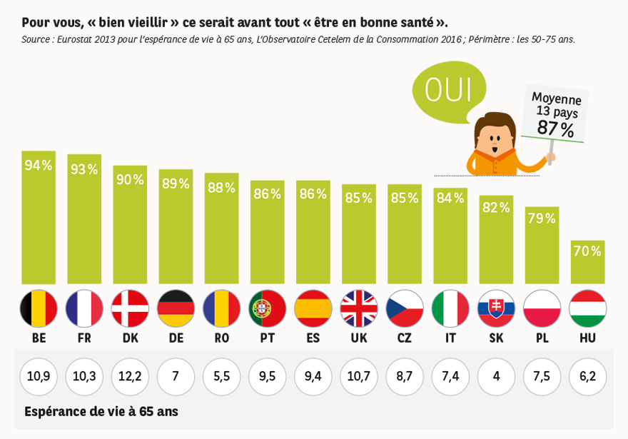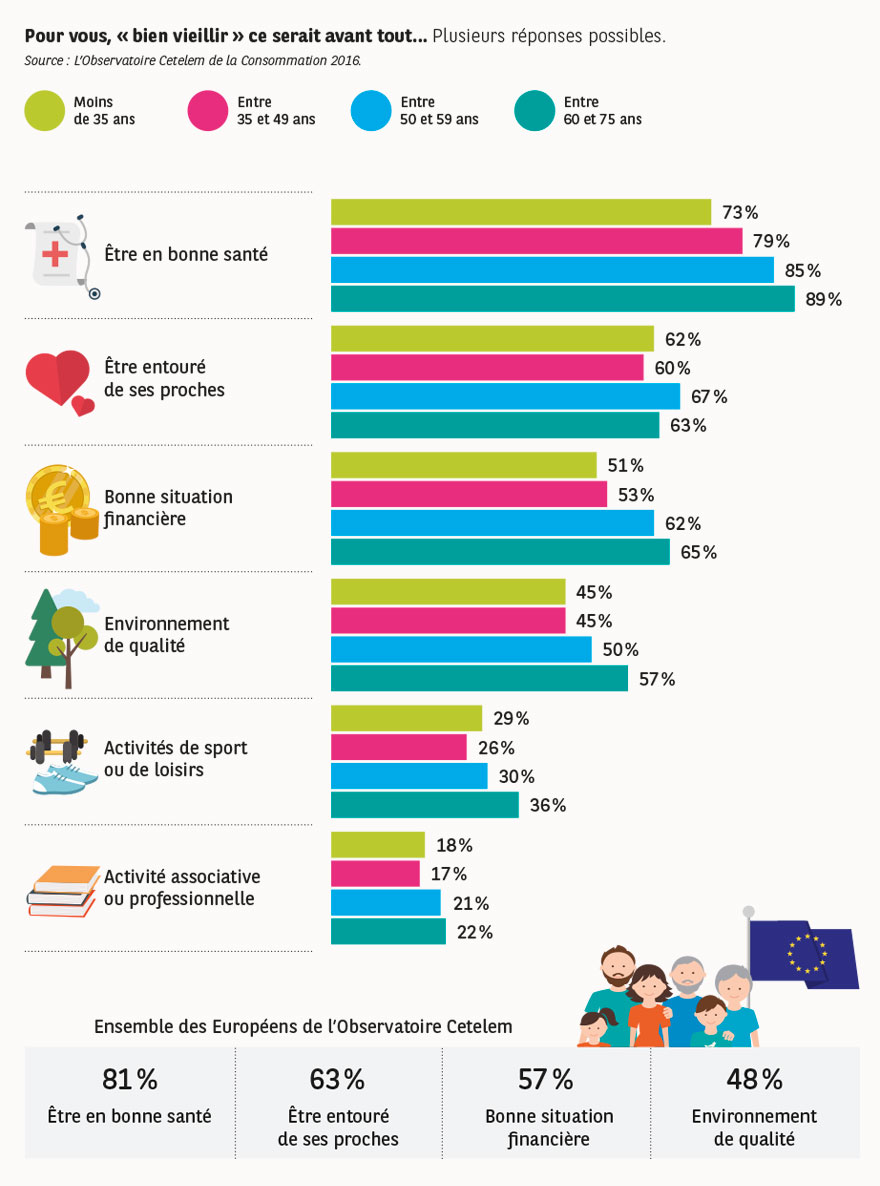 La santé est une préoccupation-clé des seniors et plus largement de tous les Européens. Les moins de 35 ans comme les 60-75 ans aspirent à pouvoir vieillir en bonne santé, et cette aspiration se renforce avec l’âge. C’est le vœu le plus cher pour plus de 85 % des seniors européens. Cette attente de bien vieillir rencontre, fort heureusement, une espérance de vie en bonne santé à 65 ans en constante amélioration.