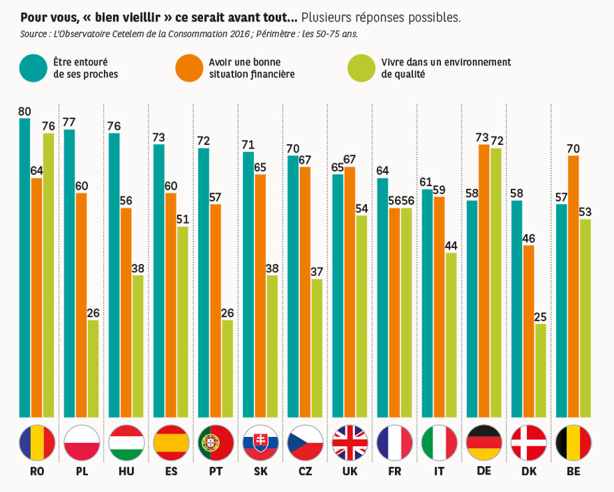 En Allemagne et en Belgique, les dimensions matérielles priment nettement sur la dimension relationnelle, et viennent en bonne place au Royaume-Uni, en France, en Italie et en Roumanie. La présence des proches est en revanche vue comme primordiale en Pologne, en Hongrie, en Espagne et au Portugal.