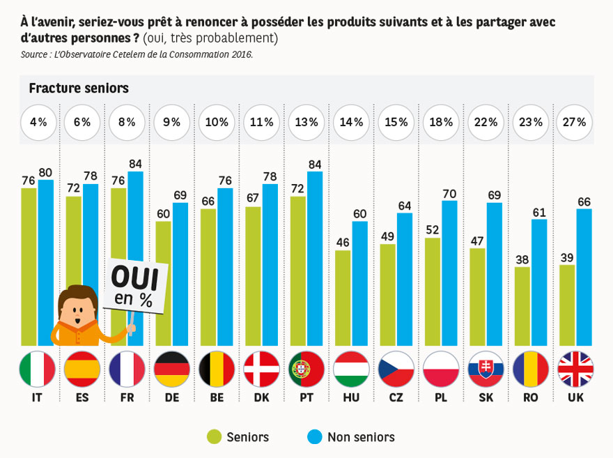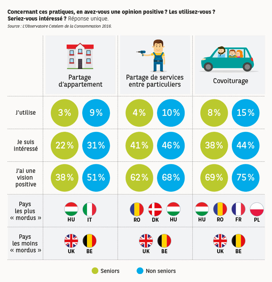 Les pays du Sud (Espagne, France, Italie et Portugal) ont une opinion bien plus favorable de l’économie collaborative et de partage que la moyenne européenne. Dans ces pays, les différences entre les seniors et leurs cadets sont les plus faibles, signe d’une diffusion large, massive et transgénérationnelle de ces nouveaux modes de consommation. À l’inverse, elle recueille moins de 50 % d’opinions positives au Royaume-Uni et dans les pays d’Europe Centrale et Orientale, bien que sa pratique soit assez répandue en Hongrie et en Roumanie.