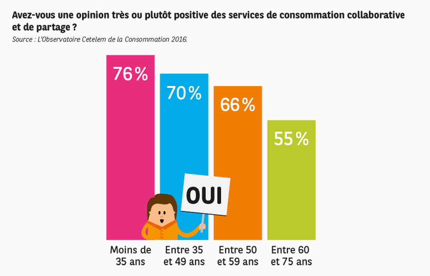 Les plus de 60 ans sont moins unanimes sur les services de consommation collaborative et de partage que les plus jeunes. 55 % ont une opinion positive des services de consommation collaborative et de partage existants. Ces nouveaux modèles restent donc frappés par un effet générationnel, même si l’usage des plus de 60 ans n’est pas non plus inexistant.
