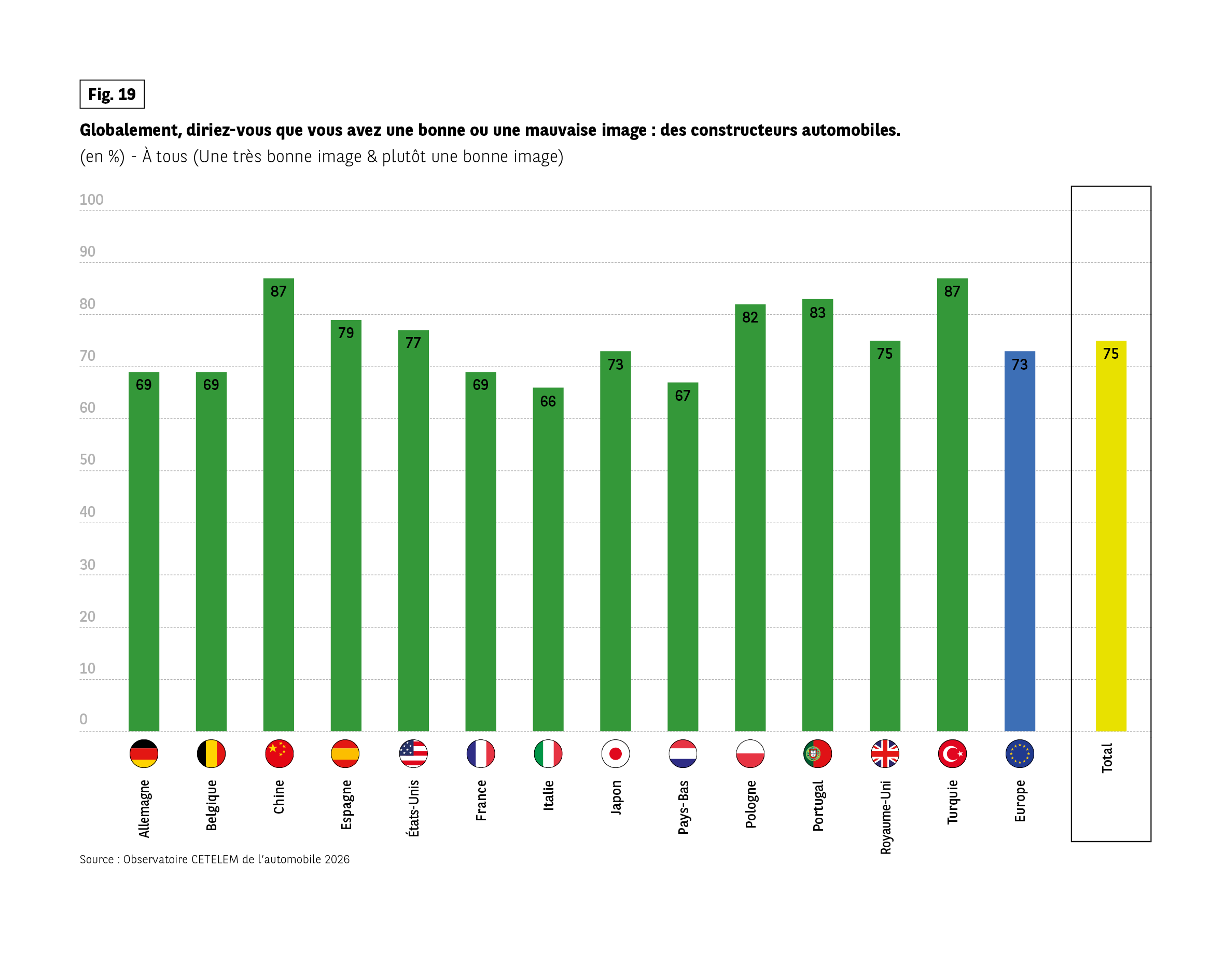 Nous avons vu précédemment que les voitures neuves faisaient l’unanimité ou presque ; les constructeurs recueillent dans une large proportion les mêmes louanges. 3 personnes interrogées sur 4 en ont une bonne ou une excellente image, (Fig. 19) leurs plus grands thuriféraires étant encore et toujours les Chinois et les Turcs (87 %).