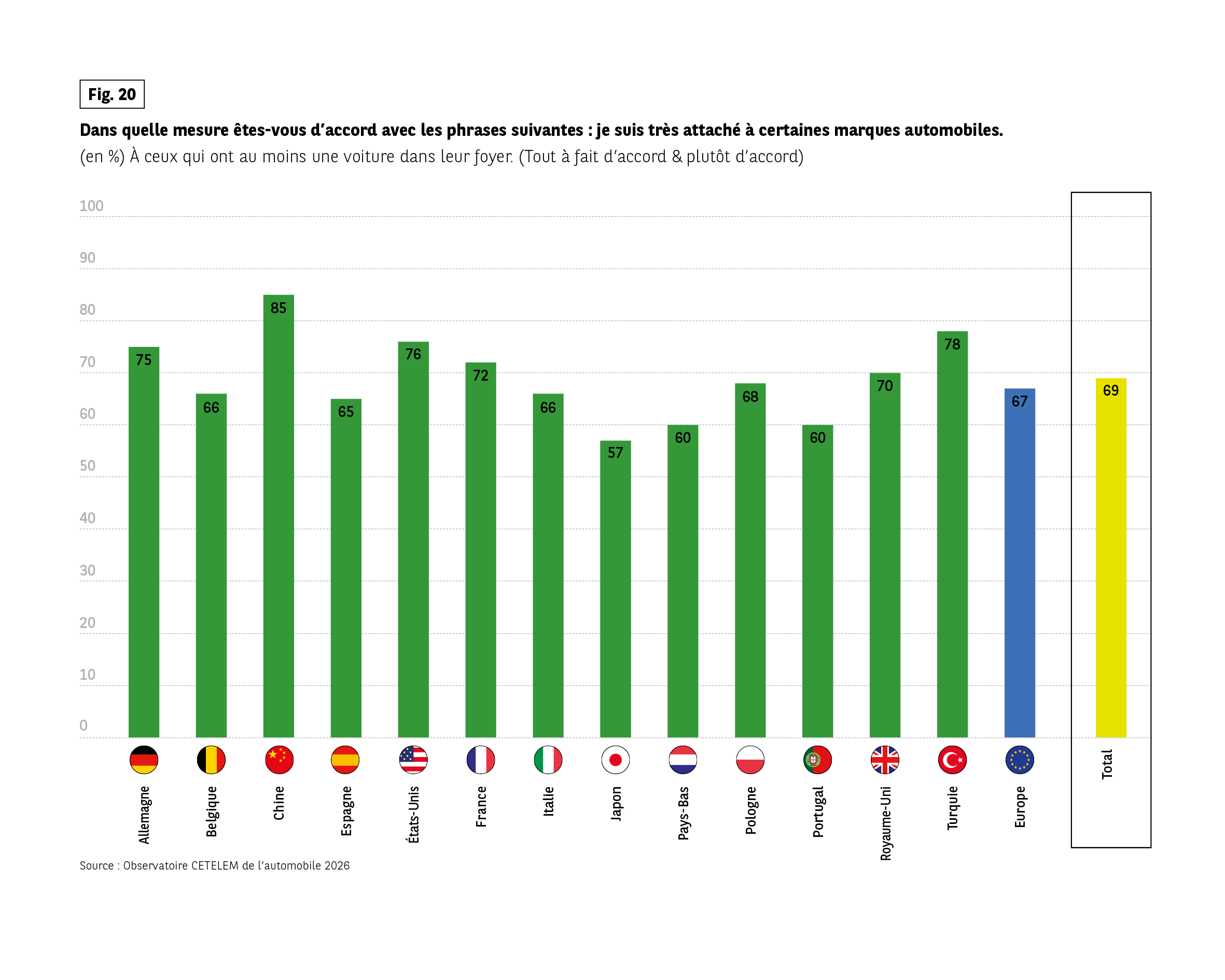 À cette sympathie pour les constructeurs se conjugue un attachement aux marques qu’ils produisent. (Fig. 20). 7 personnes sur 10 en font part, le duo sino-turc toujours devant, mais avec cette fois une suite du classement sensiblement différente. Trois pays aux marques anciennes et fortes affichent un attachement prononcé : États-Unis, Allemagne et France.