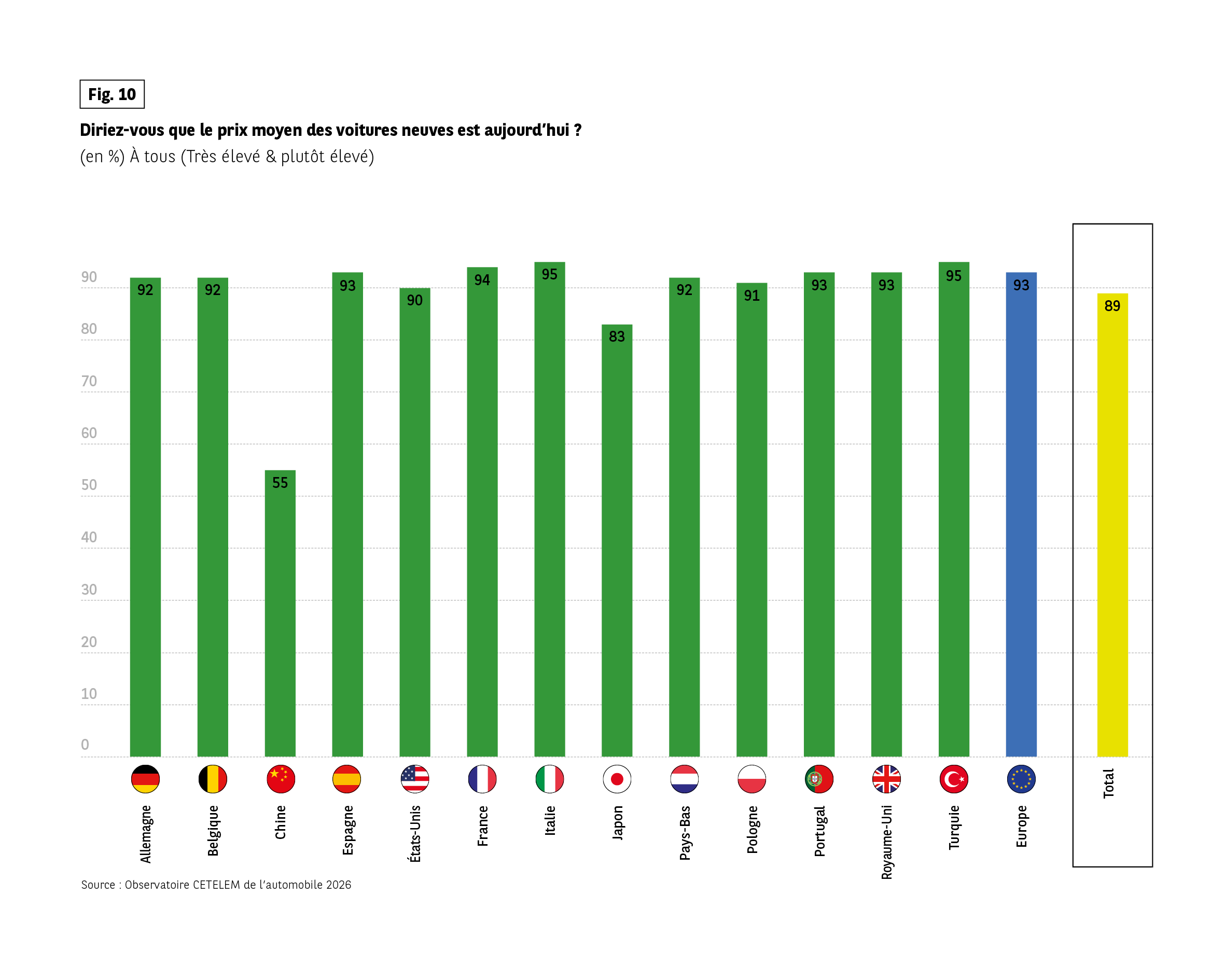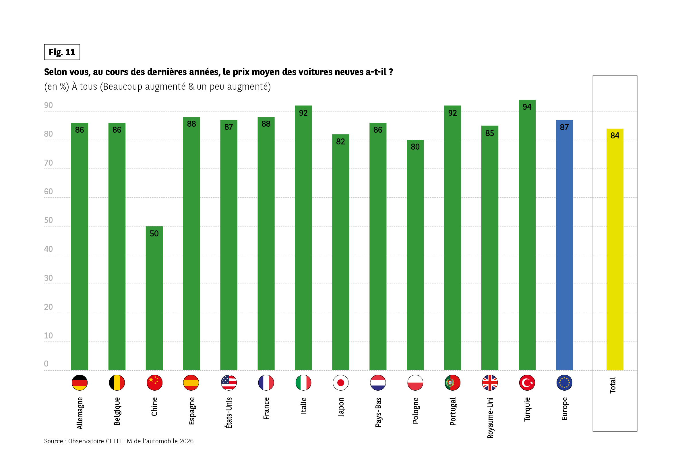 Ce sentiment de cherté se trouve renforcé par l’impression que les prix des automobiles n’ont fait qu’augmenter ces derniers temps. 84 % des personnes interrogées en sont plutôt, voire totalement convaincues, particulièrement les Turcs, les Italiens et les Portugais (94 %, 92 % et 92 %). Et du côté de l’Empire du Milieu ? Seulement la moitié des Chinois trouve que les prix ont augmenté ces dernières années. Les séniors pointent davantage que les plus jeunes cette augmentation tarifaire, de même que les habitants des zones rurales par rapport à ceux des grandes villes.