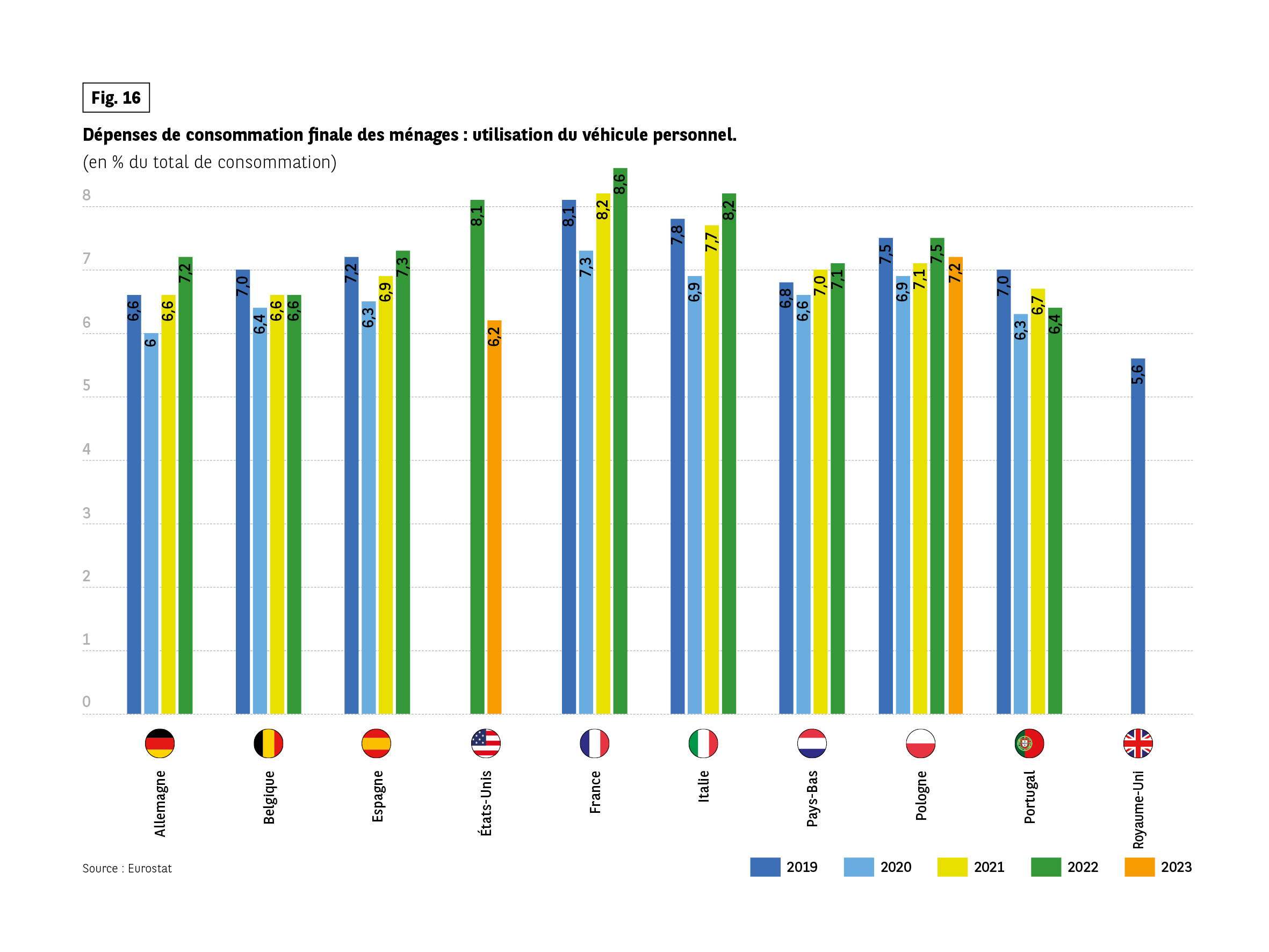 Depuis la crise sanitaire, le poids financier de la voiture se fait globalement de plus en plus sentir dans le budget des ménages, (Fig. 16) notamment européens.
