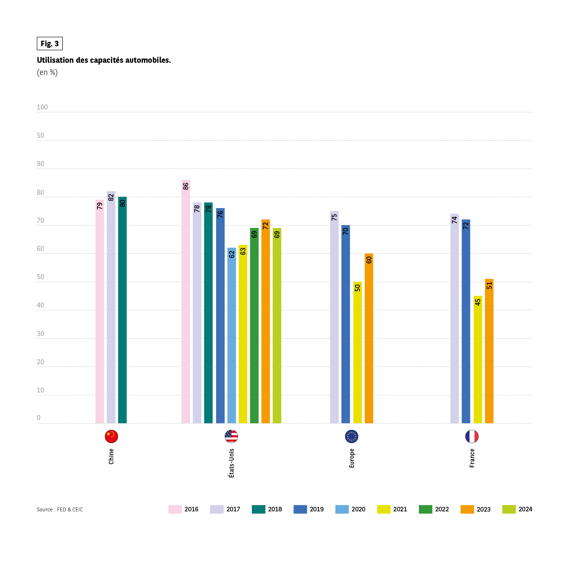 Barres annuelles représentant le taux d’utilisation des capacités automobiles pour la Chine, les États-Unis, l’Europe et la France, entre 2016 et 2024.