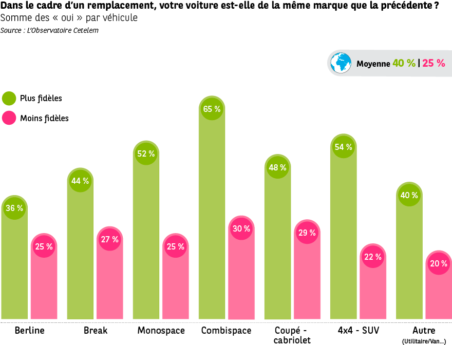 Le changement de silhouette d’un véhicule est bien une zone à haut risque pour les marques. Seulement 25 % des renouvelants changeant de voiture et de silhouette en même temps resteront fidèles à leur marque contre 40 % pour ceux qui choisissent de ne pas changer de silhouette.