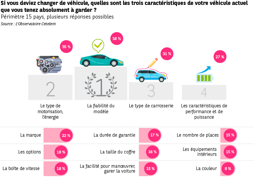 Le changement se fait cependant dans une certaine continuité. Lorsqu’il s’agit de changer de véhicule, les clients s’appuient sur certaines valeurs dans ce tourbillon de nouveautés. Fiabilité (38 %), type de motorisation (35 %) et silhouette (31 %) composent ainsi le triptyque de ces valeurs recherchées par les automobilistes interrogées. Notons que les Italiens, les Portugais, les Turcs, les Mexicains et les Français se montrent les plus attachés à la motorisation.