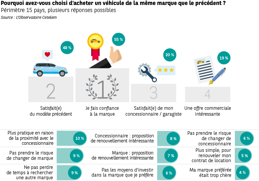 Plus de 55 % des automobilistes mettent en avant, nettement plus que tout autre motif, la confiance en la marque, la satisfaction vis-à-vis du modèle étant ensuite invoquée par 48 % d’entre eux
