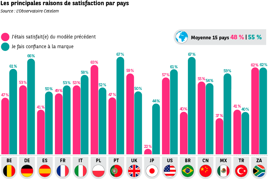 Si plus de 2 Brésiliens, Allemands et Portugais sur 3 carburent à la confiance, Polonais, Sud-Africains et Britanniques valorisent le choix du modèle précédent. Japon et Turquie se distinguent par des taux sensiblement inférieurs à la moyenne, la satisfaction vis-à-vis du modèle précédent s’avérant même très faible au Japon (22%)