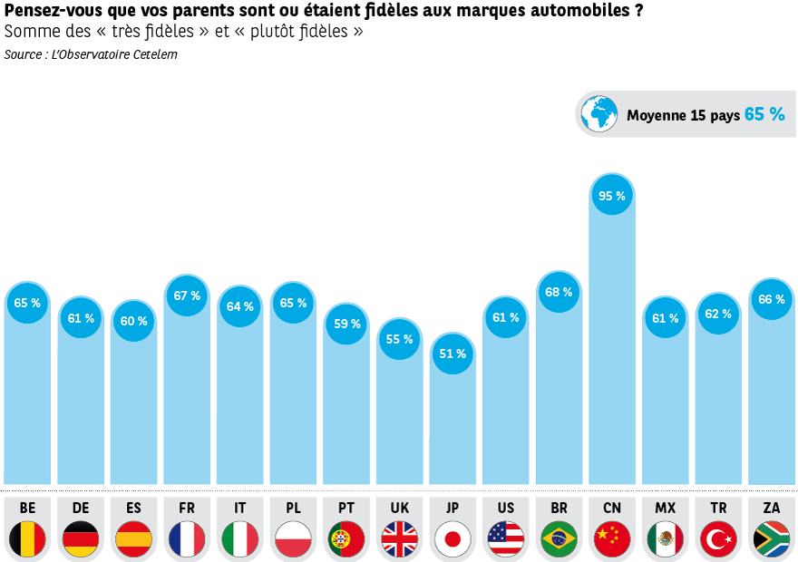 À cette époque, la constance était la règle, l’inconstance l’exception. Les interviewés de L’Observatoire Cetelem de L’Automobile 2018 semblent s’en souvenir. Les deux tiers déclarent que leurs parents étaient fidèles aux marques automobiles. 95 % des Chinois l’affirment – mais avaient-ils avant le choix des marques ? – tandis que Britanniques et Japonais ne sont que 55 % et 51 % à se remémorer la fidélité de leurs parents.