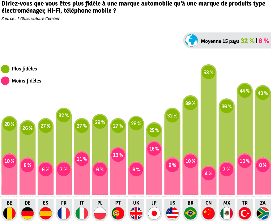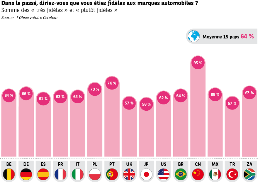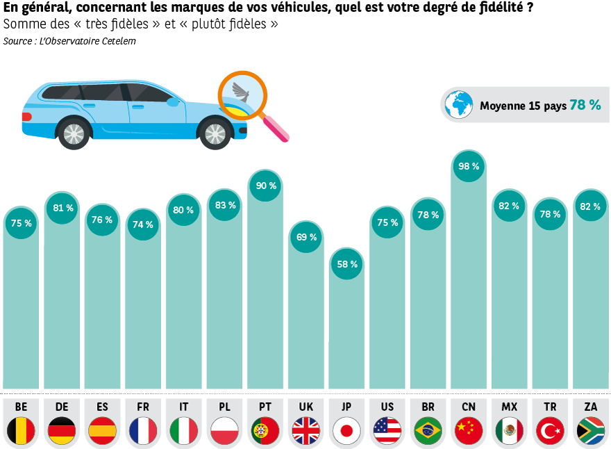 En revanche, lorsque l’on demande aux automobilistes si, eux, sont fidèles aux marques automobiles, 78 % l’affirment haut et fort. Chinois et Portugais culminent à 98 et 90 % de fidélité. 5 autres pays s’affichent attachés à leur marque à plus de 80 %. Britanniques et Japonais feraient presque figures d’instables avec « seulement » 69 et 58 % de fidélité déclarée.