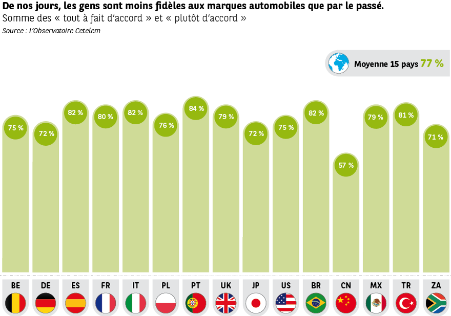 La tentation du changement serait donc apparue plus tard. Sur des marchés jusqu’alors fermés, l’accès à des marques internationales facilité par une déferlante de publicités et de promotions de plus en plus aguichantes a exacerbé la concurrence. Les automobilistes paraissent, en effet, avoir conscience d’un effritement de la loyauté passée. Plus de 70 % pensent que les acheteurs sont moins fidèles qu’avant. La Chine se démarque encore ; 57 % de répondants seulement perçoivent une perte de fidélité au cours du temps.