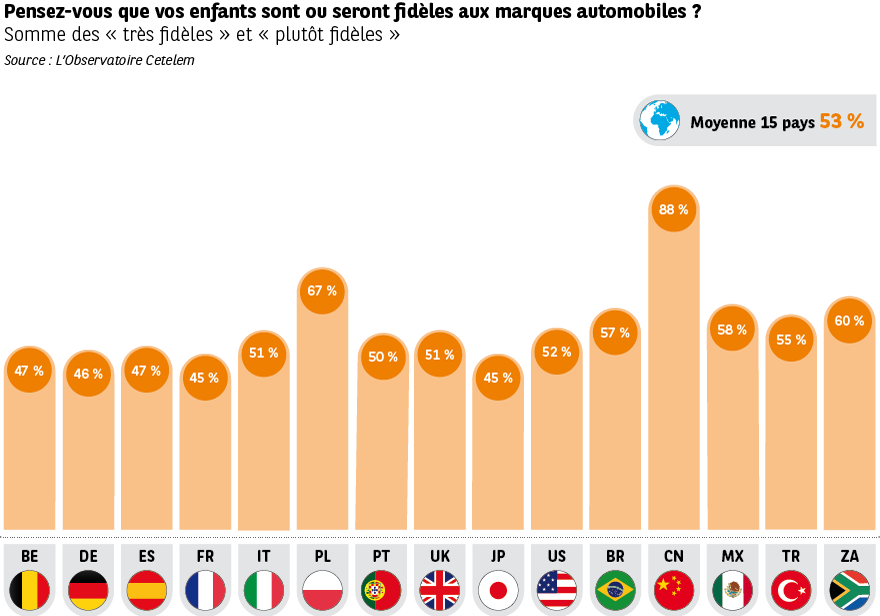 L’avenir paraît également moins porteur de constance. Quand ils se projettent sur la fidélité automobile de leurs enfants, les automobilistes ne sont plus que 53 % à les imaginer fidèles. Tous les pays occidentaux anticipent que leur descendance approchera ou passera sous le seuil des 50 % à conserver la même marque. Seuls une fois encore les Chinois, et dans une moindre mesure les Polonais, prêtent de plus stables attitudes aux générations futures (88 % et 67 %).