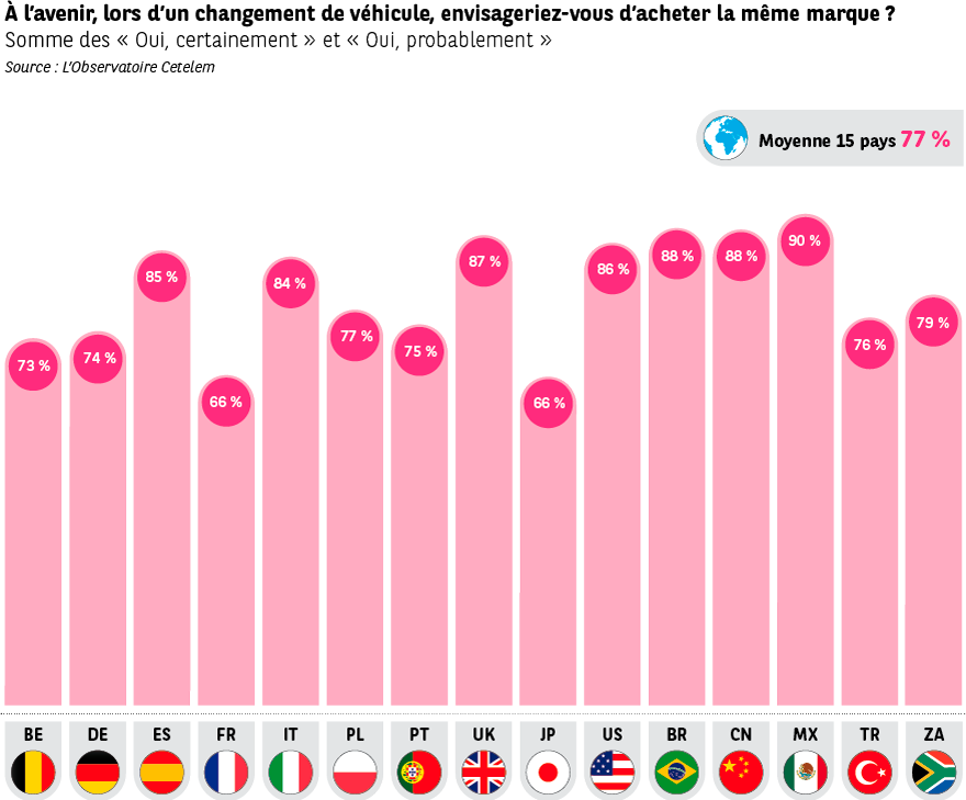 Effectivement, lorsque le questionnement se fait un peu plus précis, les certitudes ne faiblissent pas. Les intentions d’achat dans la même marque sont encore de 77 % pour l’ensemble des pays. Dans de nombreux cas, la fidélité se renforce avec le temps. Britanniques, Espagnols, Américains, Brésiliens, Mexicains et Japonais déclarent qu’ils seront davantage fidèles lors du prochain changement de véhicule. En Belgique, en Italie, en Pologne, en Turquie et en Afrique du Sud, les intentions prochaines sont plus modérées et se rapprochent des déclarations générales. On ne trouve guère que les Portugais, les Chinois, les Allemands et les Français pour anticiper une loyauté en baisse à l’occasion du prochain passage en concession.