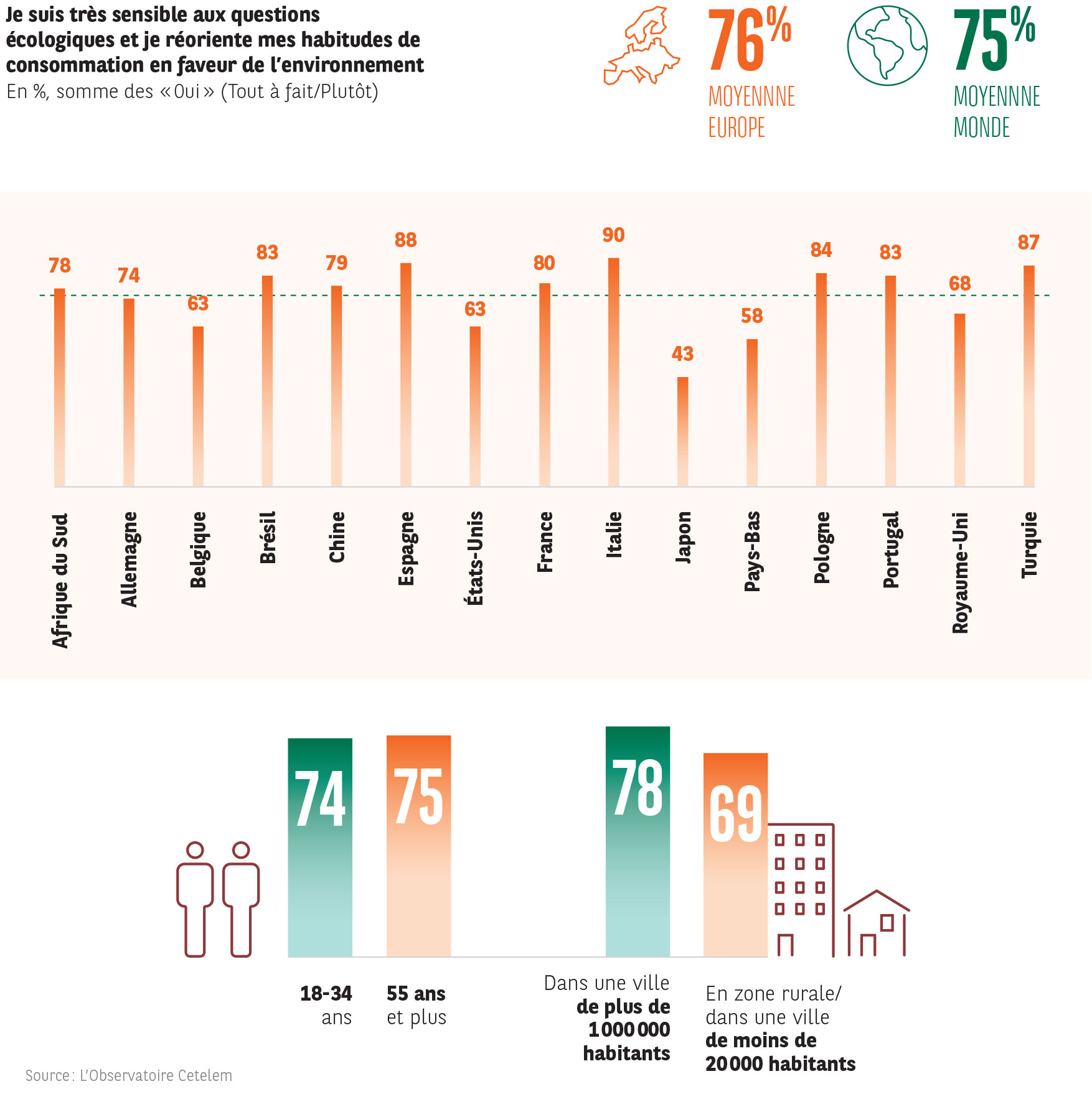 Trois quarts des personnes interrogées sont sensibles à l’environnement et déclarent avoir réorienté, à ce titre, leurs habitudes de consommation (Fig. 13 et 14). Italiens, Espagnols et Turcs sont les plus affirmatifs alors que les Japonais, qui ont pourtant subi de nombreux accidents ou phénomènes naturels environnementaux, sont les moins nombreux (44 %). Si les millennials américains sont plus engagés que leurs aînés et les citadins chinois plus impliqués que leurs concitoyens des champs, les différences sont, somme toute, peu notables au sein de chaque pays. La partition ville/champs marque le plus de différence avec des citadins plus sensibles à des choix de consommation écologiques