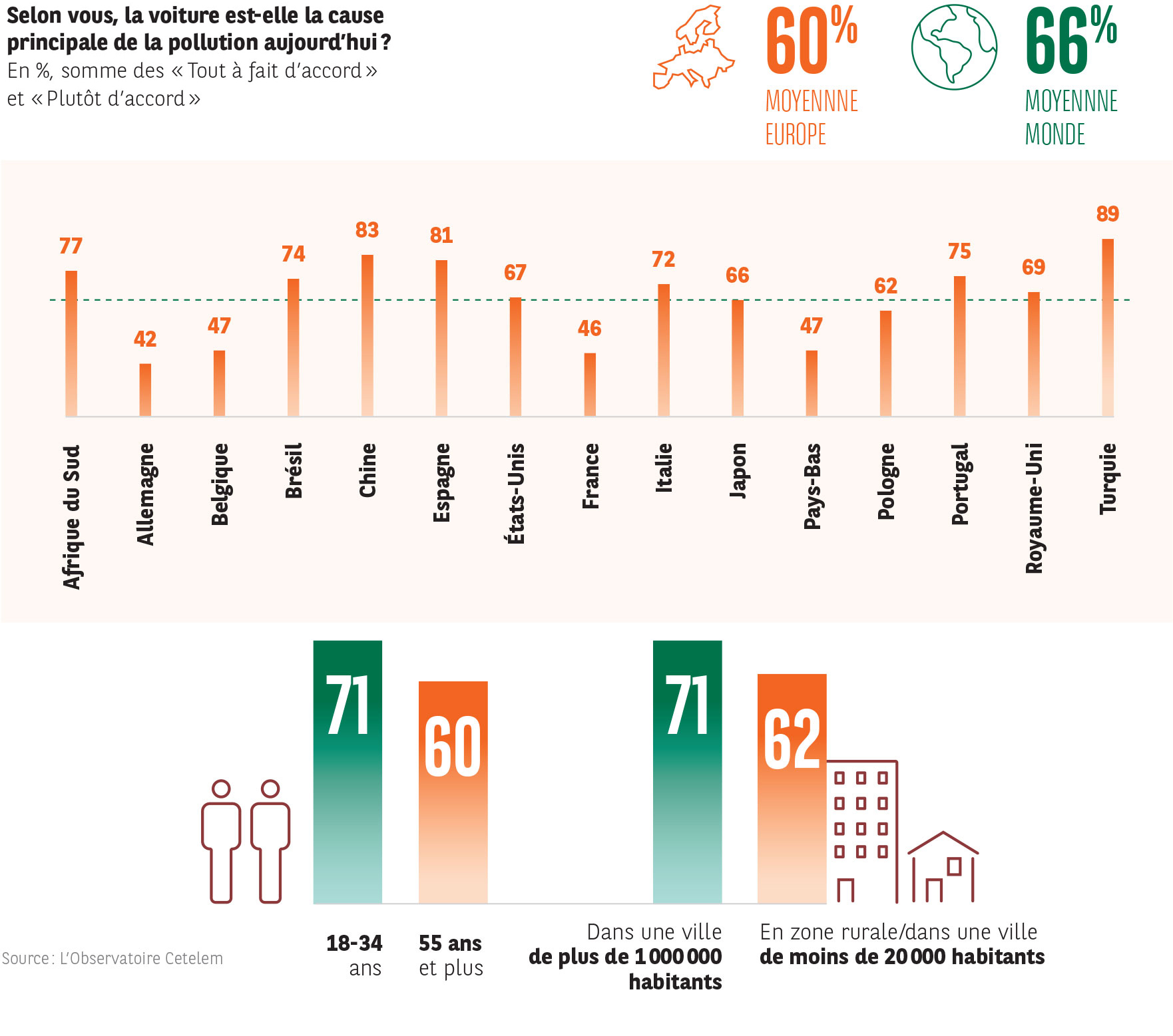 Turquie, Chine, Afrique du Sud et Brésil la condamnent sans nuances (89 %, 83 %, 77 %, 74 %). La péninsule Ibérique les rejoint pour un avis tout aussi tranché. À l’opposé, la plupart des économies développées se montrent beaucoup moins virulentes (Allemagne 42 %, France 46 %, Belgique 47 %, Pays-Bas 47 %). Les différences générationnelles sont également très aigües. En France, les millennials sont deux fois plus nombreux que les seniors à juger l’automobile principale source de pollution (63 % vs 30 %). En Allemagne, en Belgique et aux Pays-Bas, la proportion est presque identique. On retrouve aussi des écarts importants en Afrique du Sud et au Royaume-Uni.