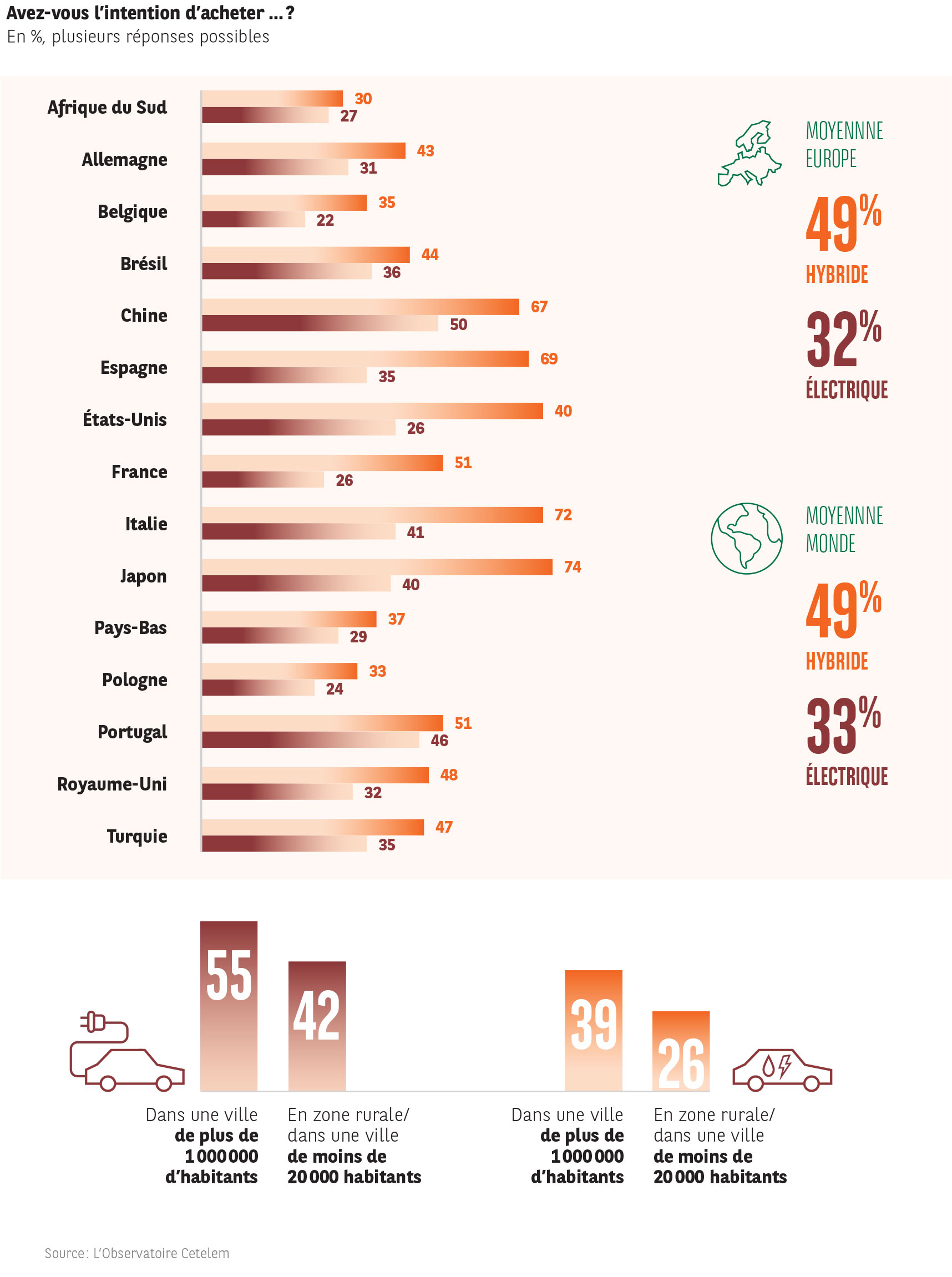 Géographiquement, les intentions d’« achats écologiques » sont particulièrement fortes au Japon, en Italie, en Espagne et en Chine qui plébiscitent l’hybride (respectivement 74 %, 72 %, 69 % et 67 %). On retrouve à nouveau la Chine avec le Portugal et encore l’Italie et le Japon pour envisager de façon forte le choix électrique (50 %, 46 %, 41 % et 40 %).