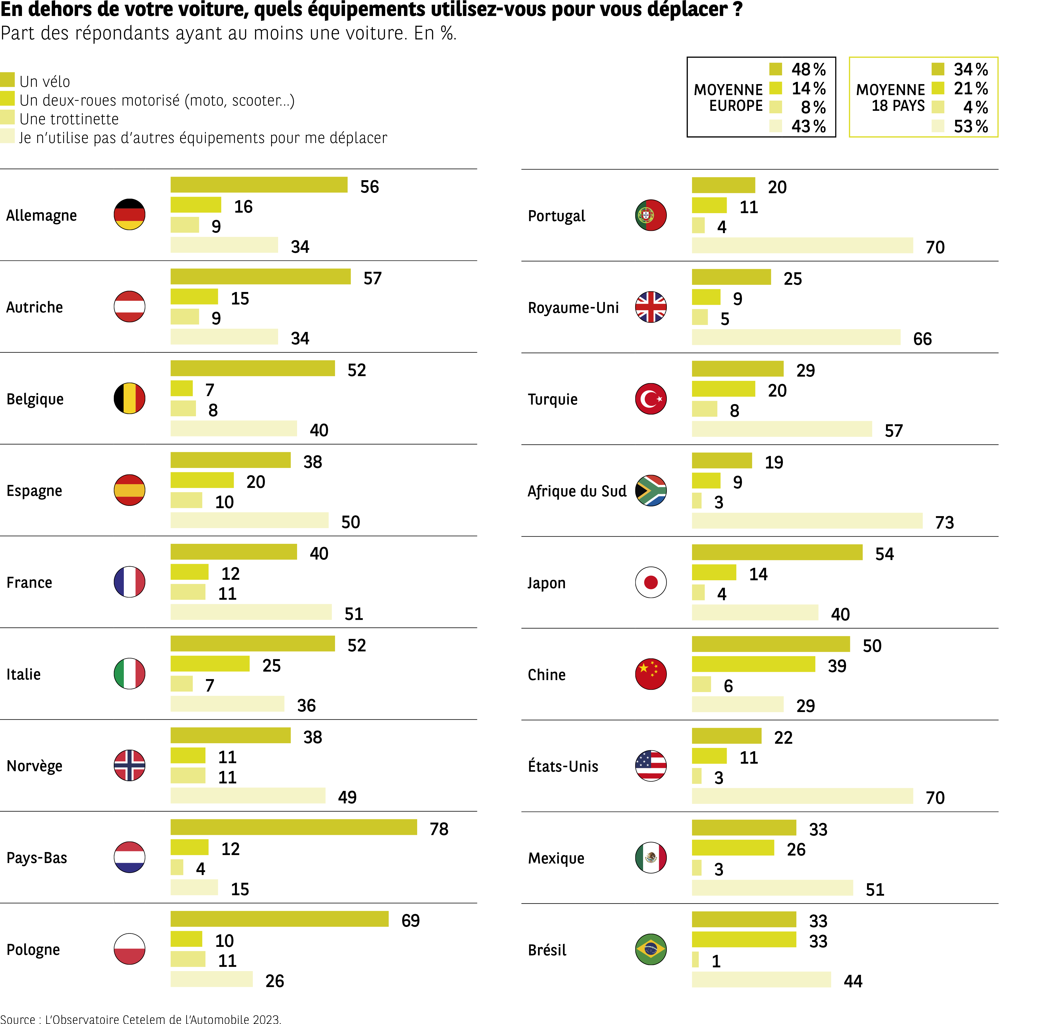 L’infographie présente, par pays, la part des répondants utilisant différents équipements pour se déplacer en dehors de leur voiture : vélo, deux-roues motorisé, trottinette ou aucun autre équipement.