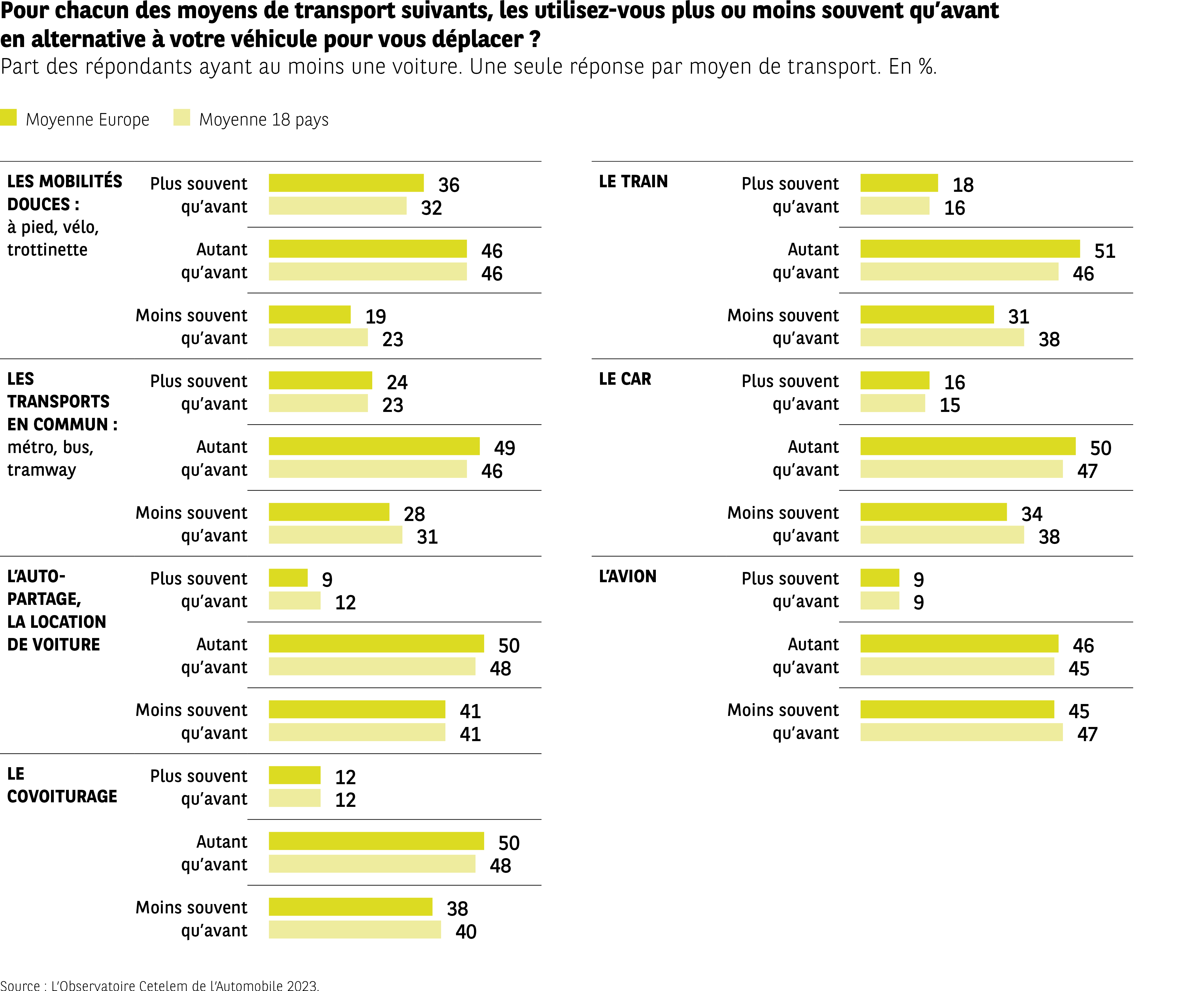 L’infographie présente la part de répondants utilisant divers moyens de transport plus, autant ou moins souvent qu’avant, parmi les personnes disposant d’au moins une voiture. Deux séries de données sont affichées : moyenne Europe et moyenne des 18 pays.