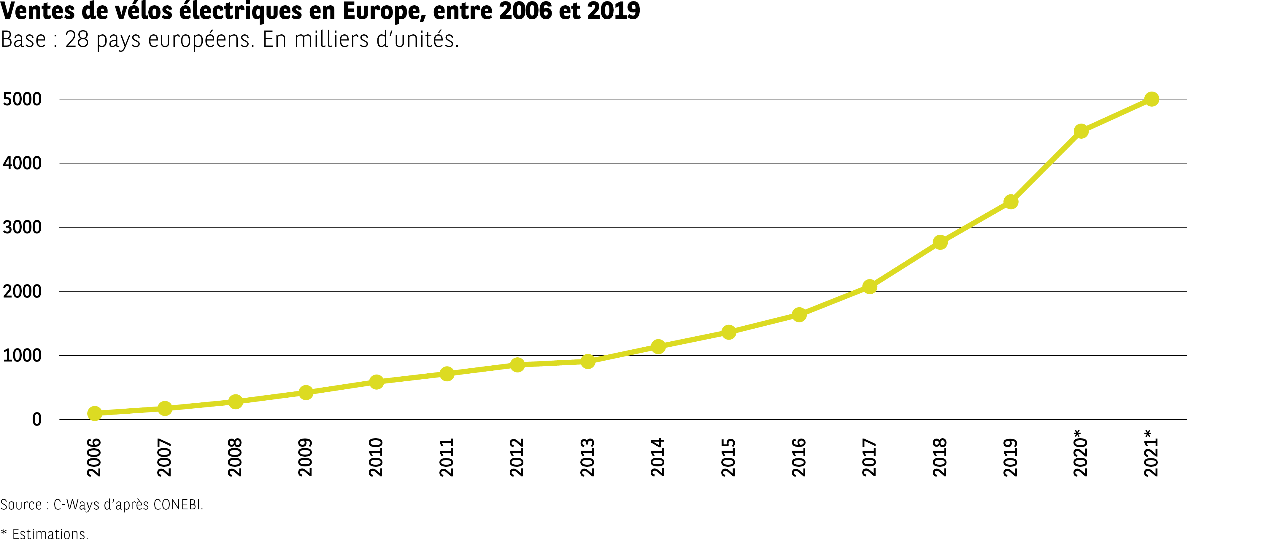 L’infographie représente l’évolution des ventes de vélos électriques en Europe entre 2006 et 2019, exprimées en milliers d’unités, sur la base de 28 pays européens. Les années 2020 et 2021 sont indiquées comme estimations.