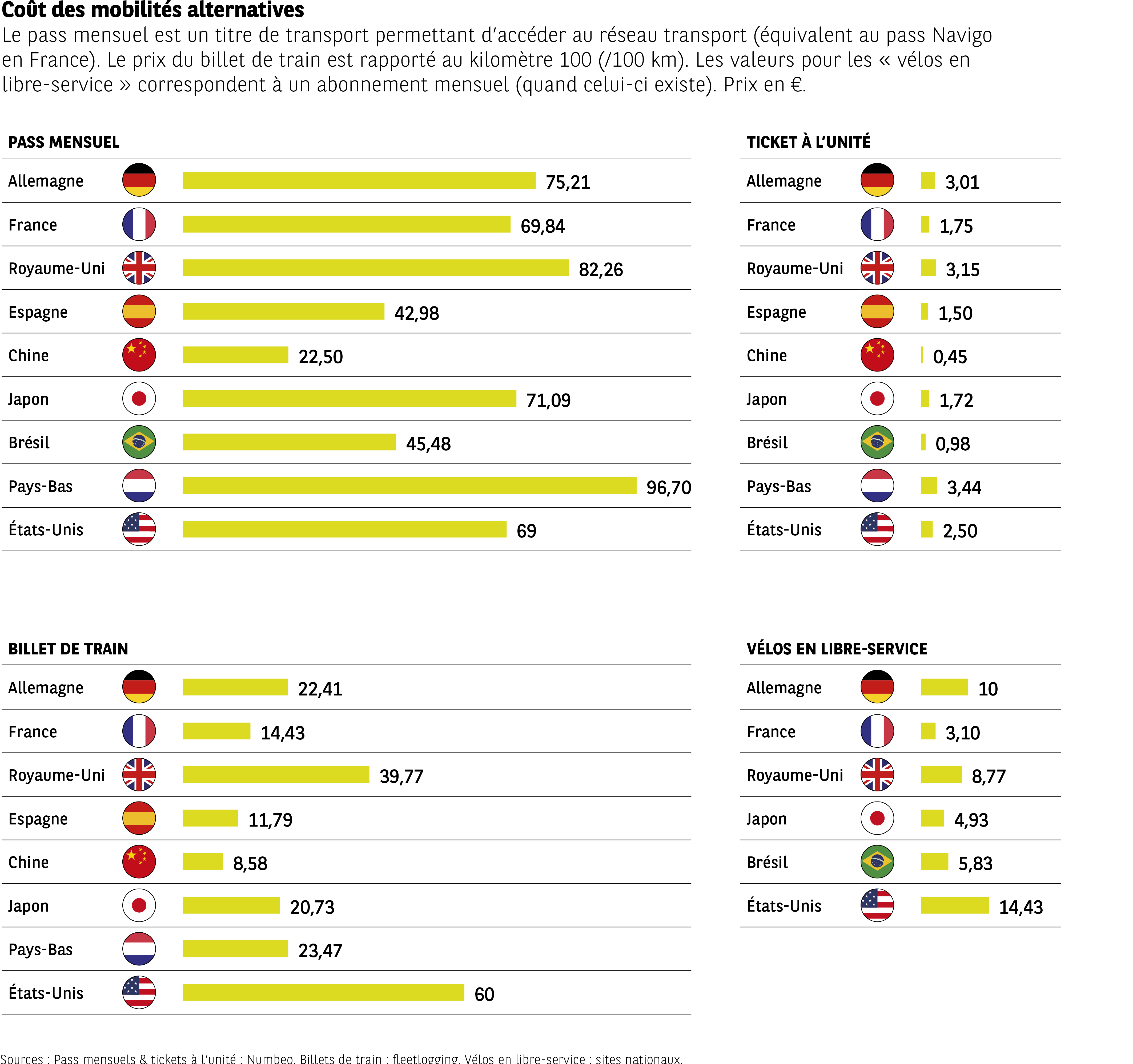 Sources : Pass mensuels & tickets à l’unité : Numbeo ; billets de train : fleetlogging ; vélos en libre-service : sites nationaux.