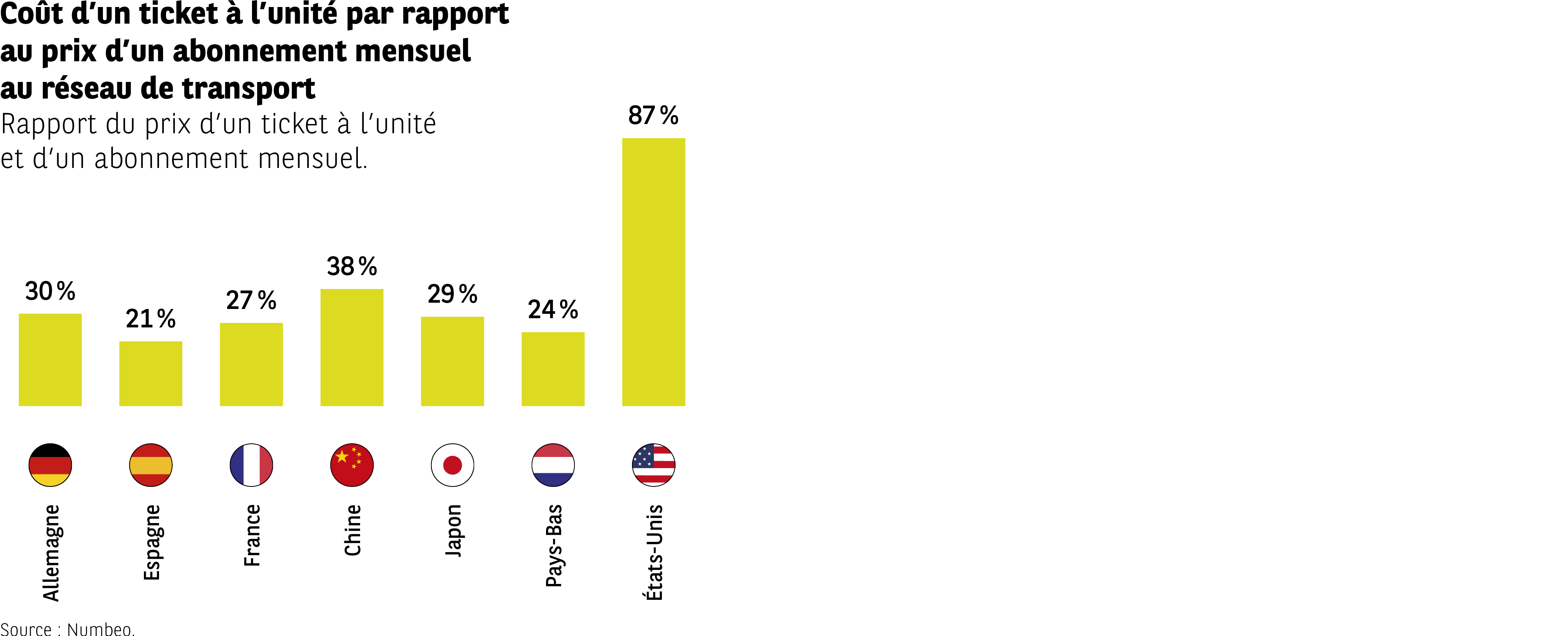 L’infographie compare, pour plusieurs pays, le rapport entre le prix d’un ticket de transport à l’unité et le coût d’un abonnement mensuel.