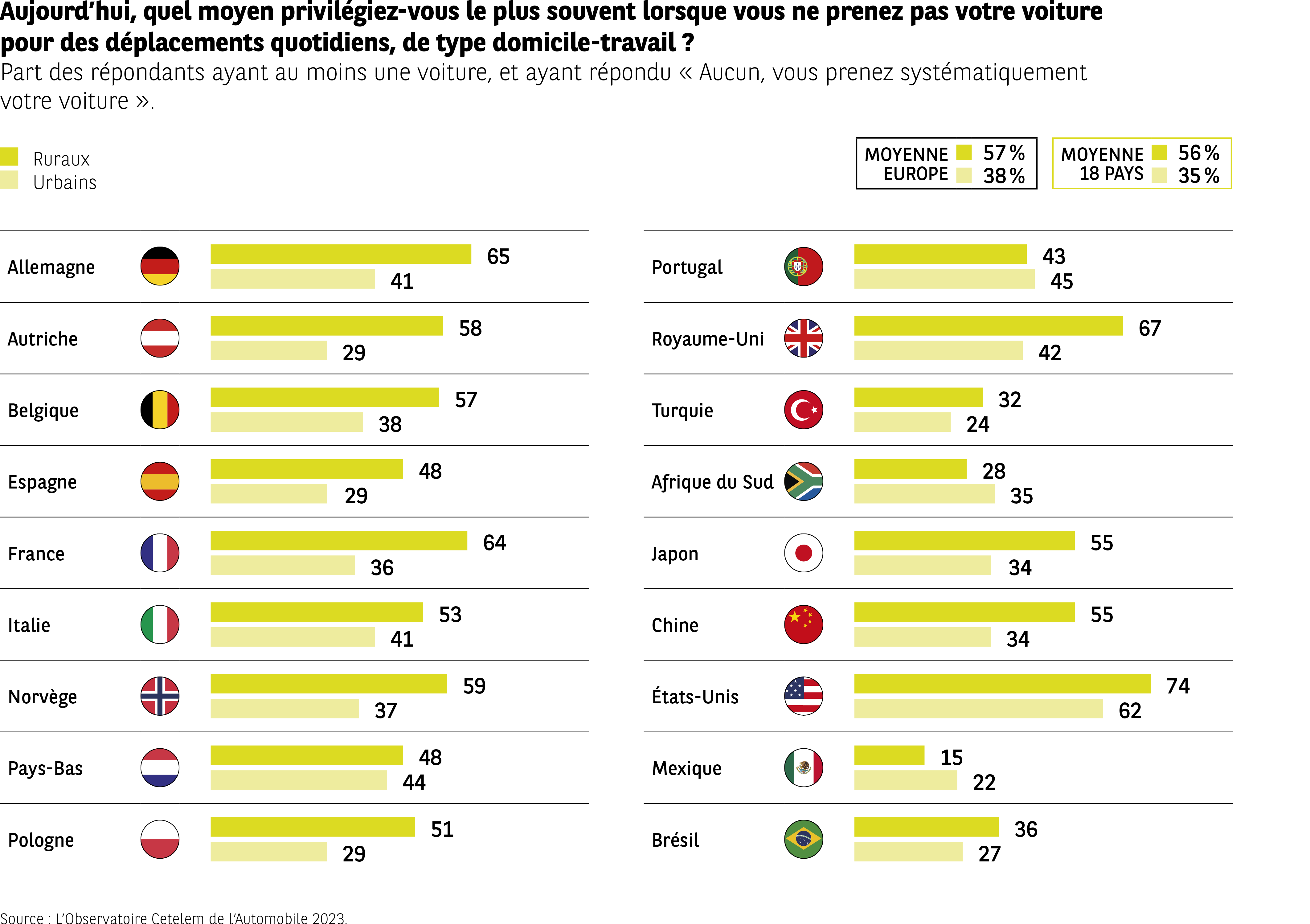 L’ensemble montre que, dans de nombreux pays, les ruraux déclarent plus souvent privilégier un autre mode que les urbains.