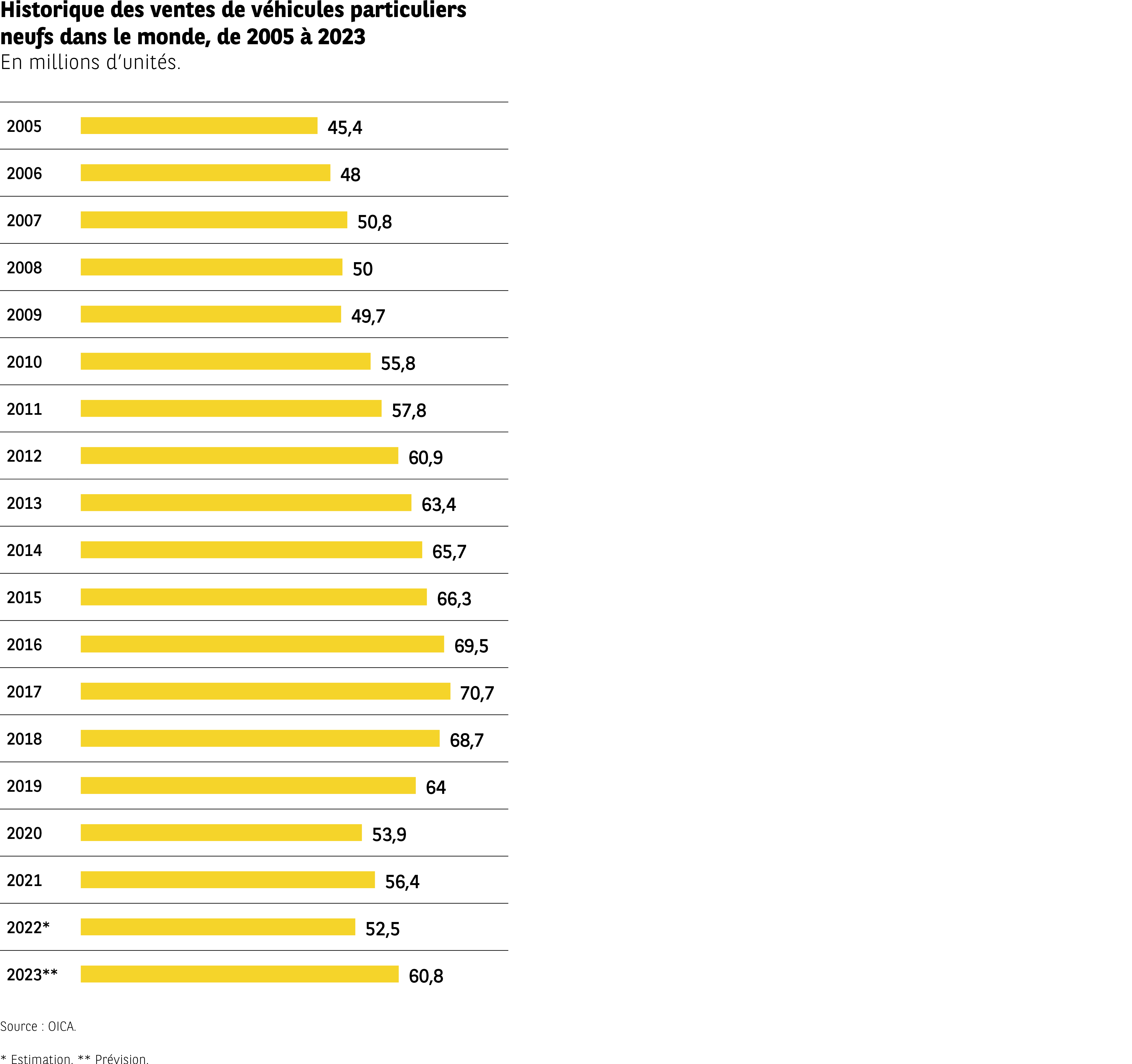 L’infographie présente l’évolution des ventes mondiales de véhicules particuliers neufs entre 2005 et 2023, exprimées en millions d’unités.