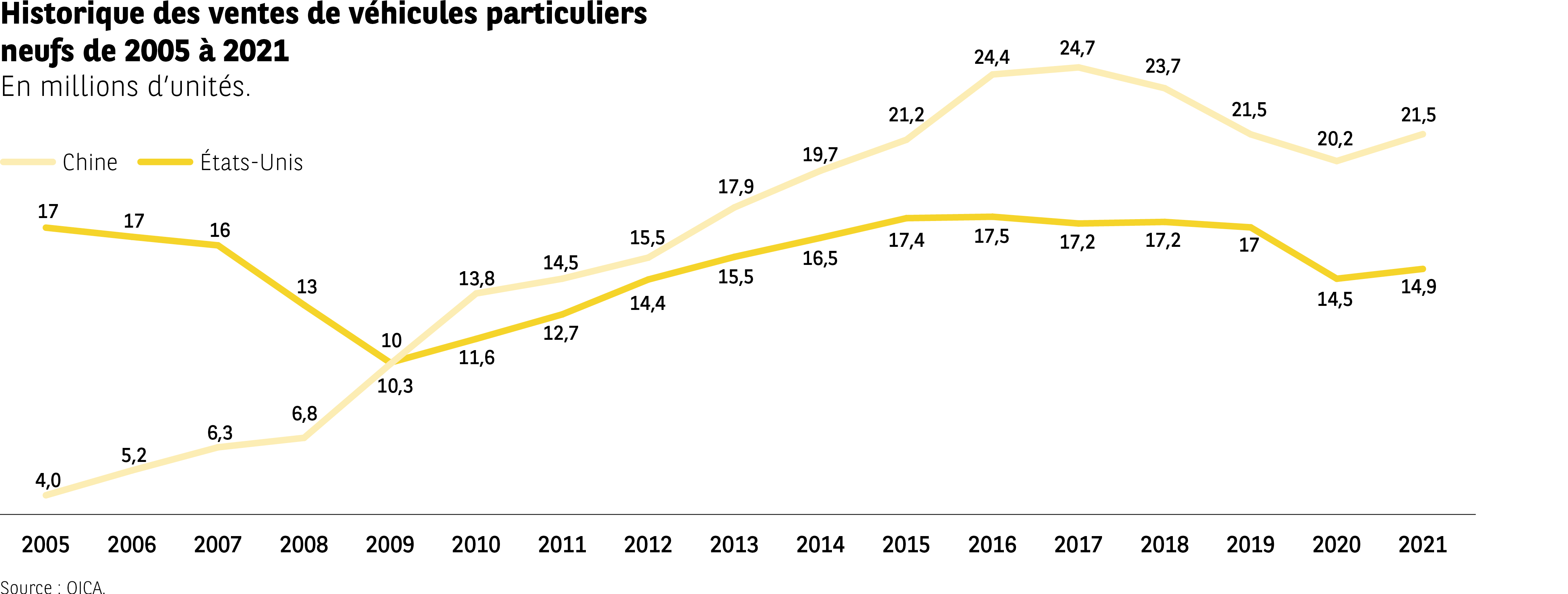 L’infographie compare les ventes annuelles de véhicules particuliers neufs en Chine et aux États-Unis entre 2005 et 2021.