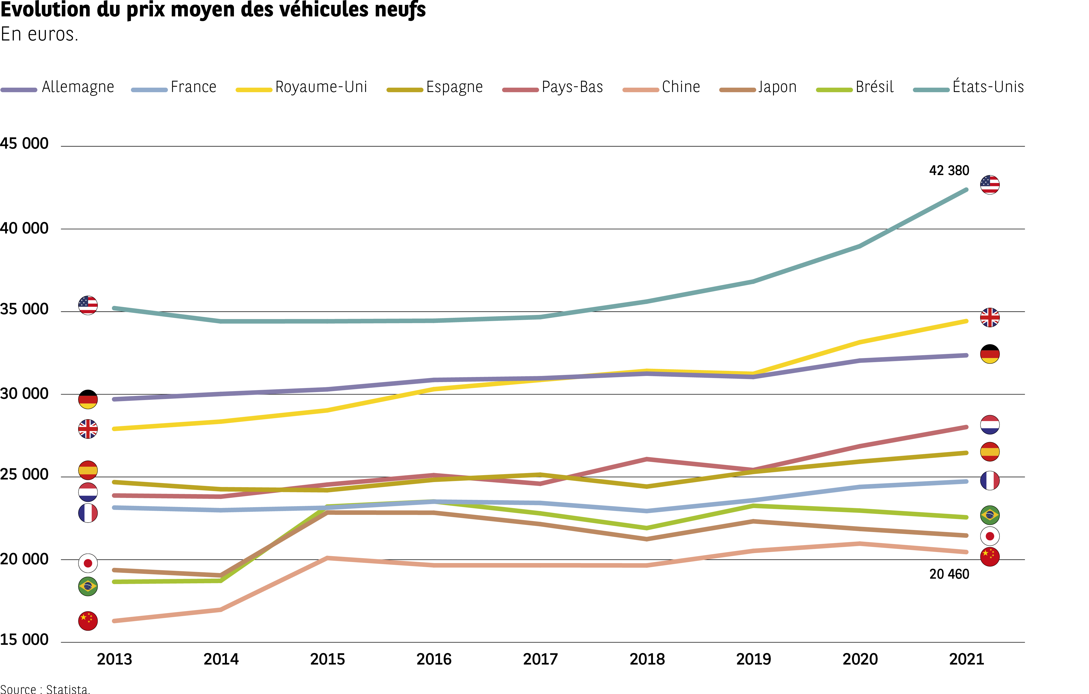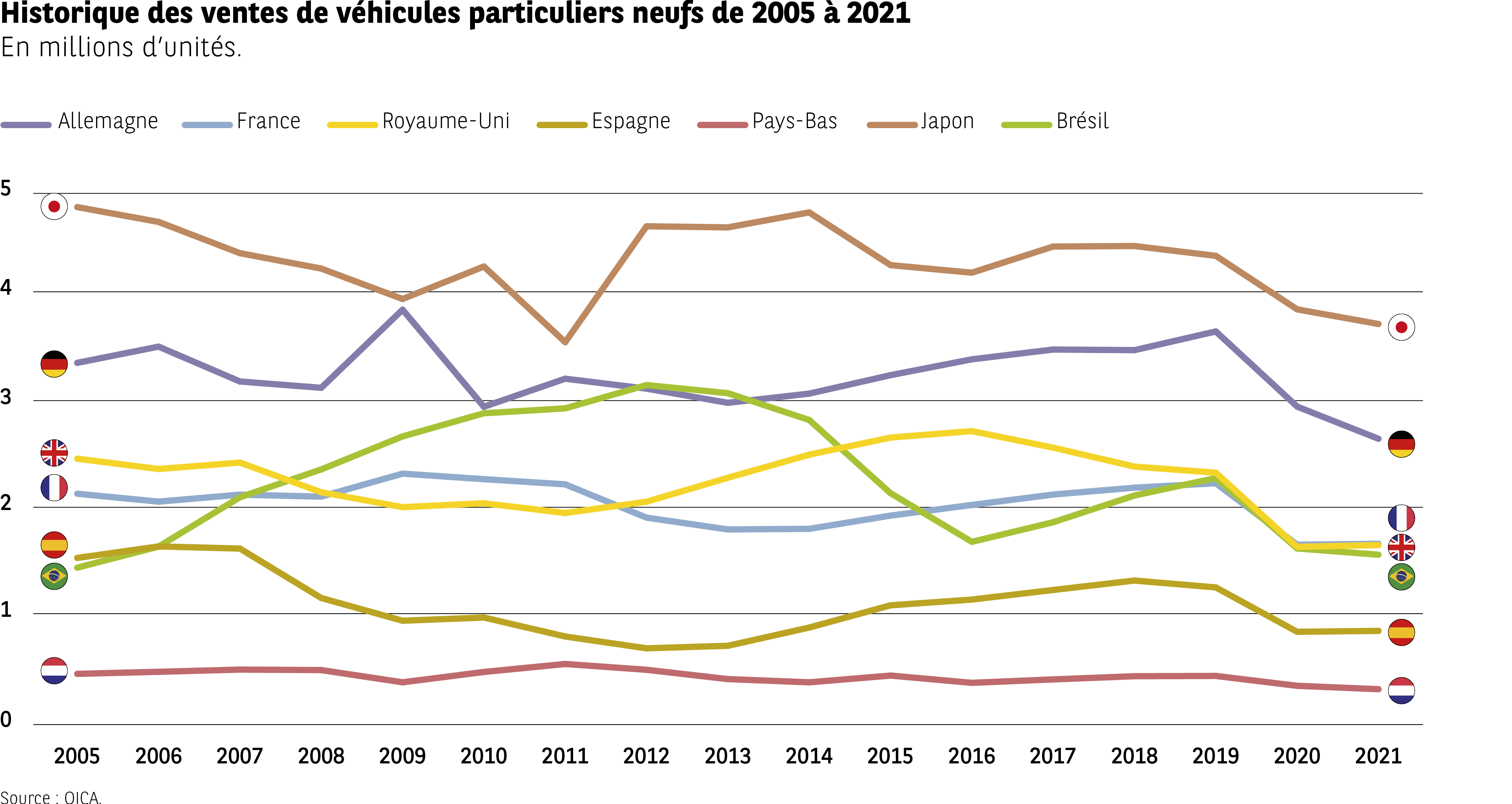 L’infographie présente les ventes annuelles de véhicules particuliers neufs entre 2005 et 2021 pour sept pays : Allemagne, France, Royaume-Uni, Espagne, Pays-Bas, Japon et Brésil.