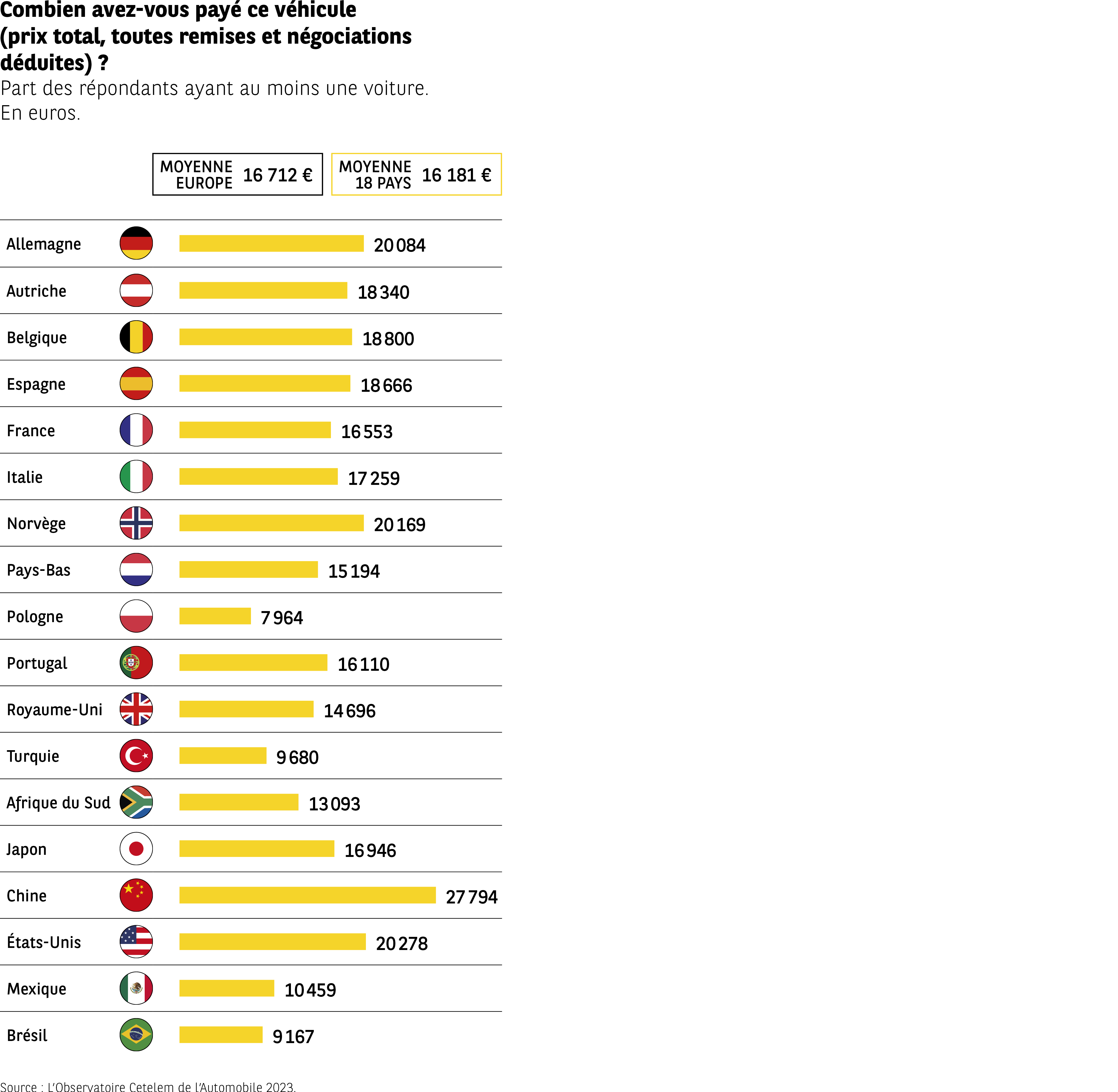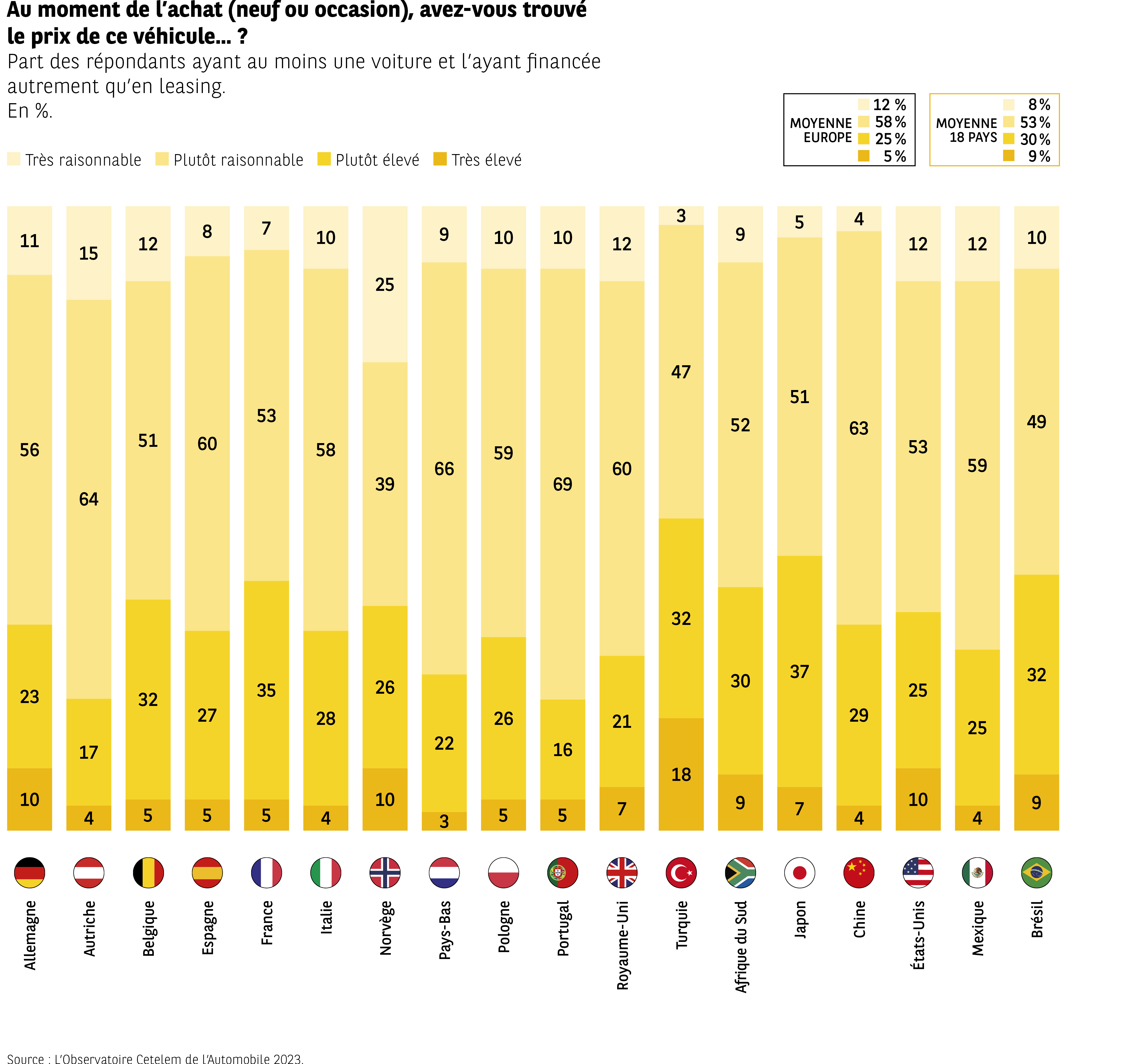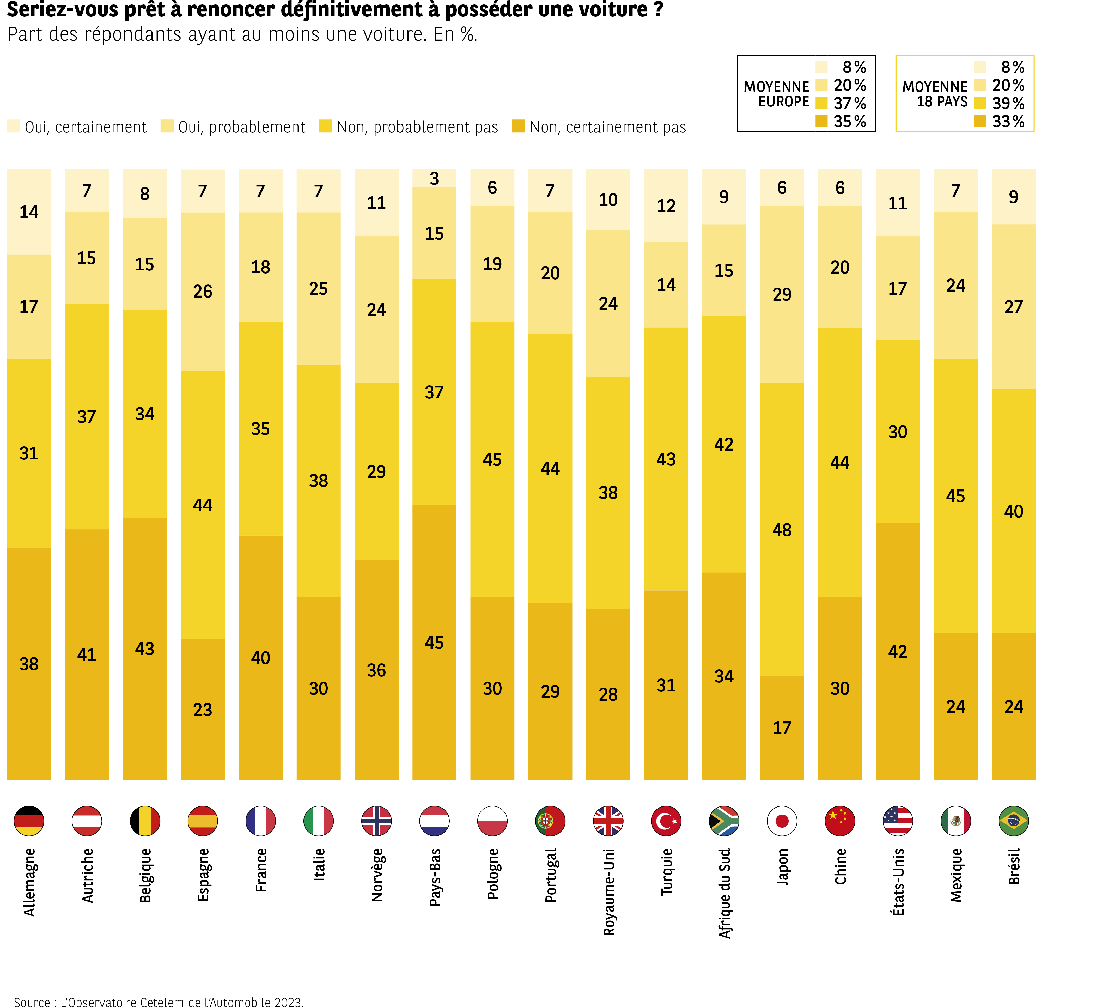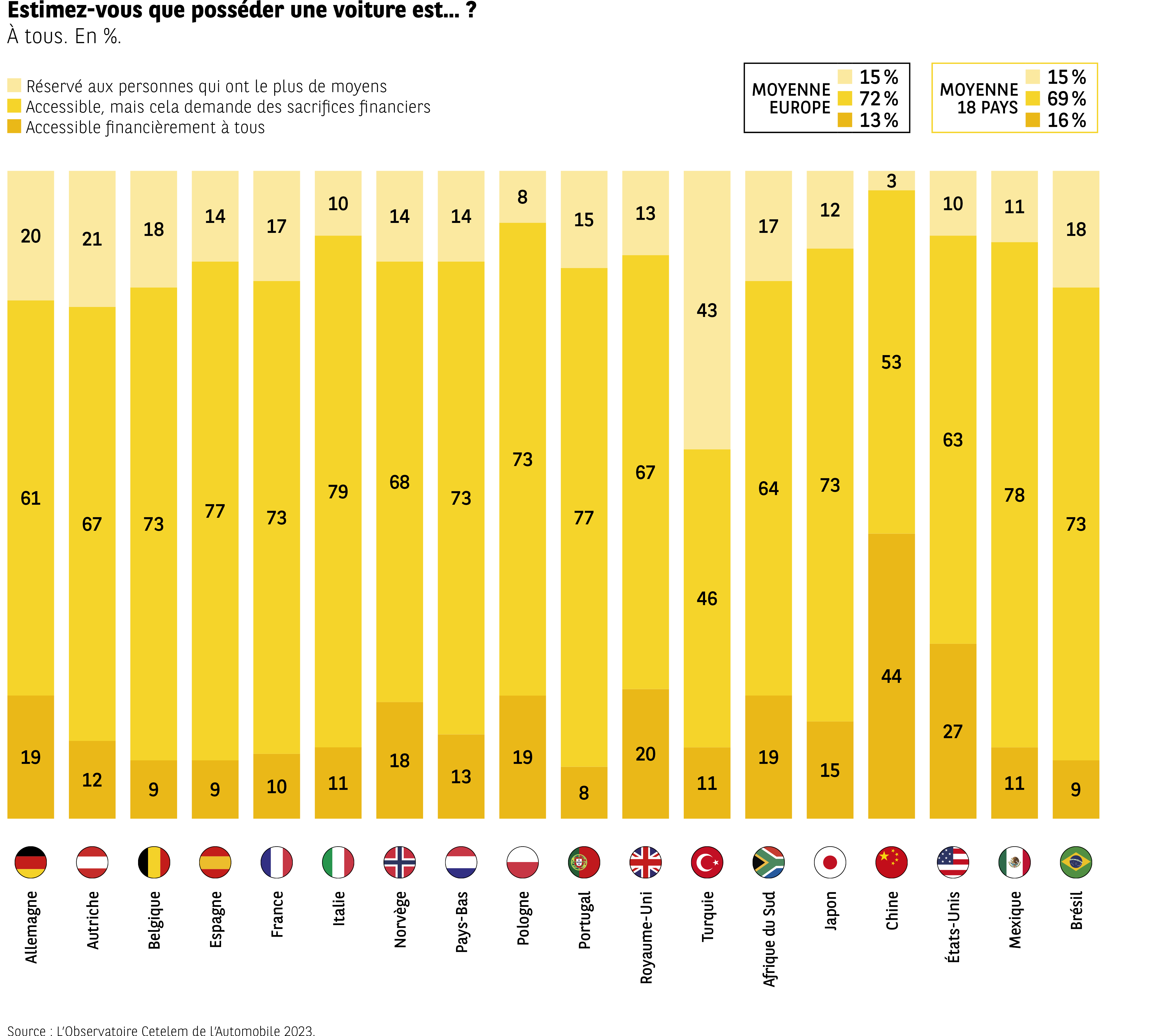 Cette voiture, accessible mais qui exige des sacrifices, reste fondamentalement chère aux yeux des automobilistes, tant ils s’accordent pour juger sa possession indispensable. Pour trois-quarts d’entre eux, impossible ou presque de renoncer à posséder un véhicule, point de vue qui globalement ne crée pas de scission entre les pays européens et ceux du reste du monde.