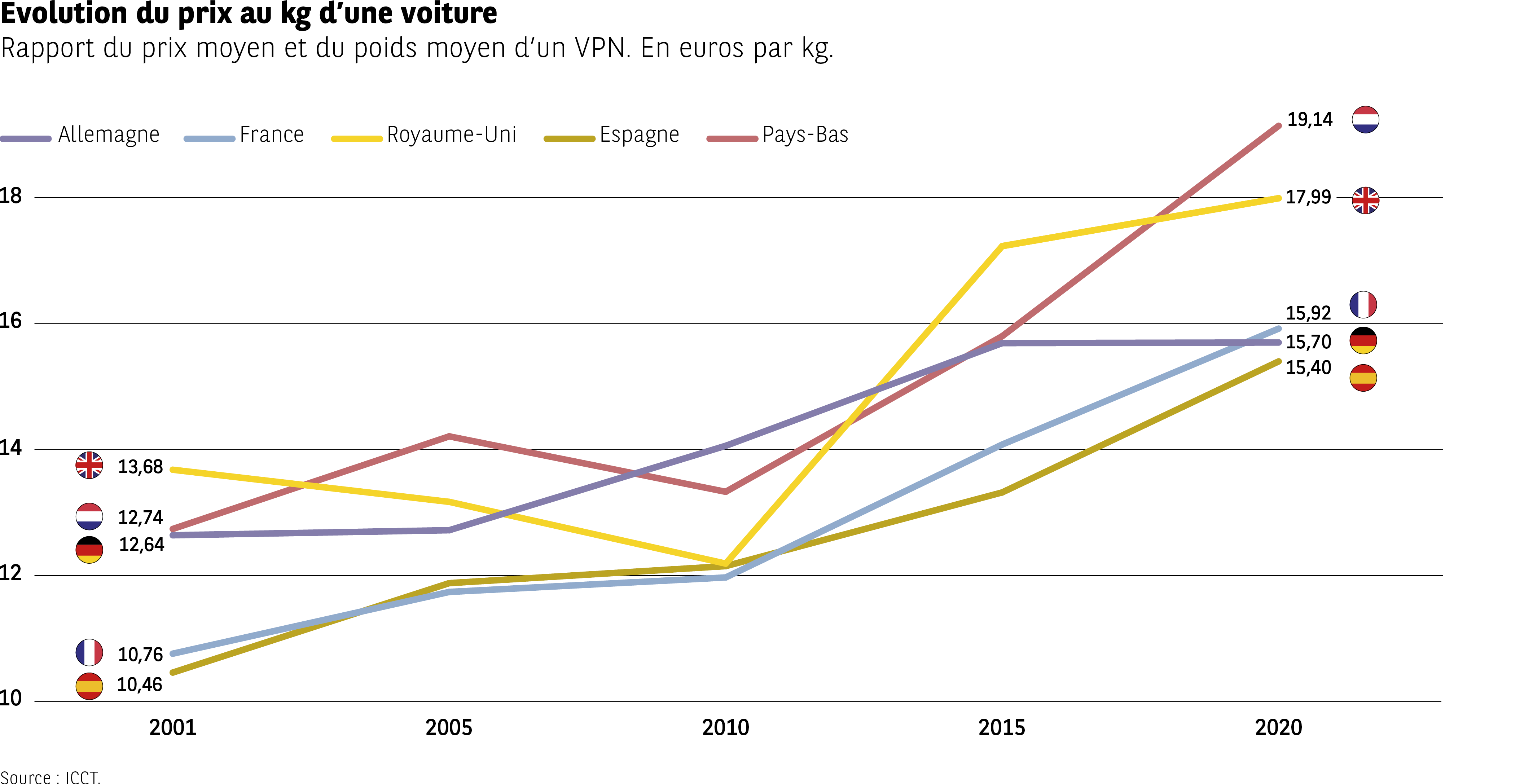 Faute de statistiques homogènes à travers le monde, l’évolution précise et rigoureuse dans le temps de ce taux d’effort est quasi impossible mais lorsque l’on considère sur la période récente le ralentissement – voire recul – des revenus, et parallèlement la hausse du contenu technique des voitures, notamment électriques, on imagine sans difficulté que ces taux se sont extrêmement tendus.