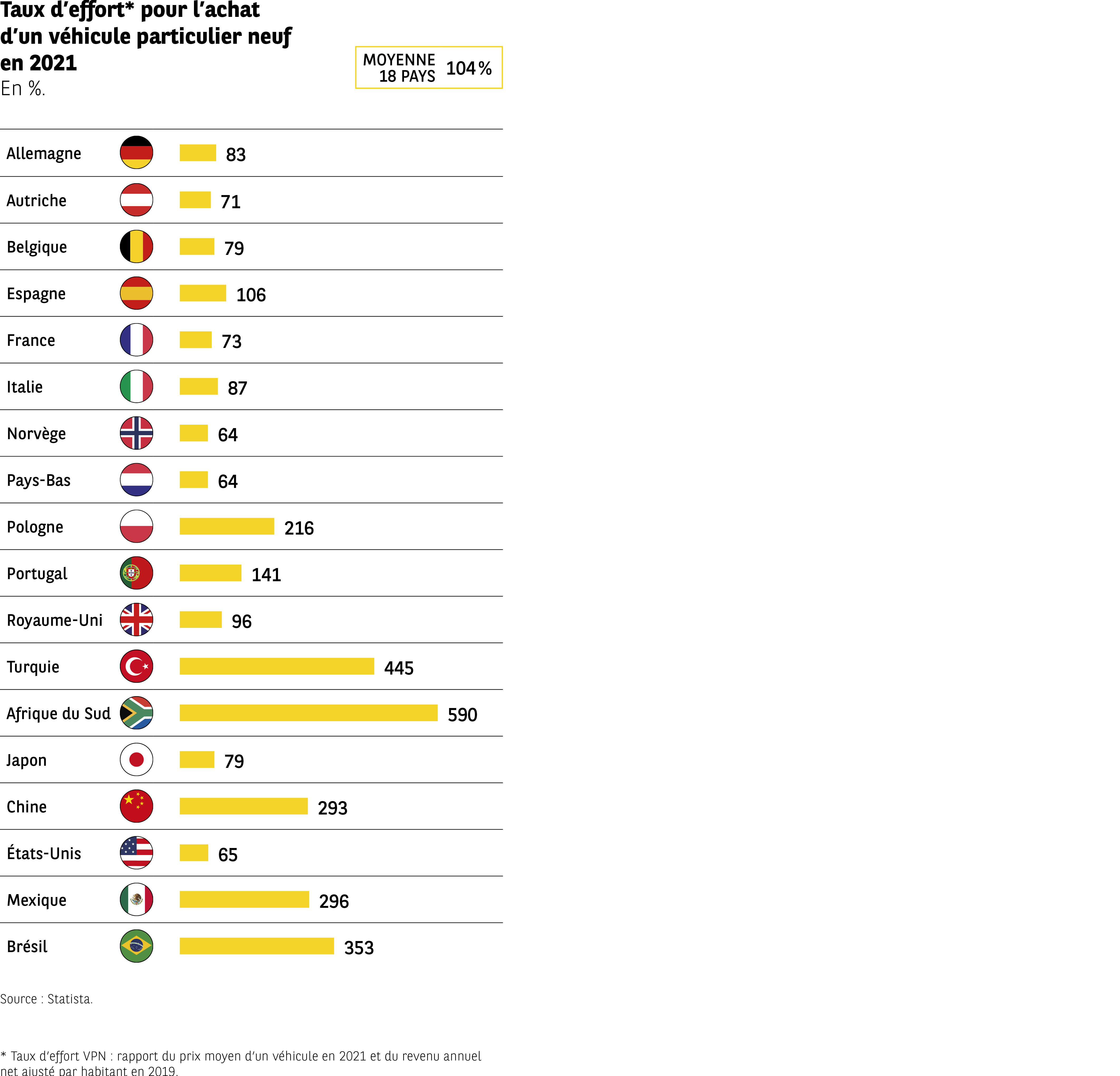 *Taux d’effort VPN : rapport du prix moyen d’un véhicule neuf en 2021 au revenu annuel ajusté par habitant (année 2019)