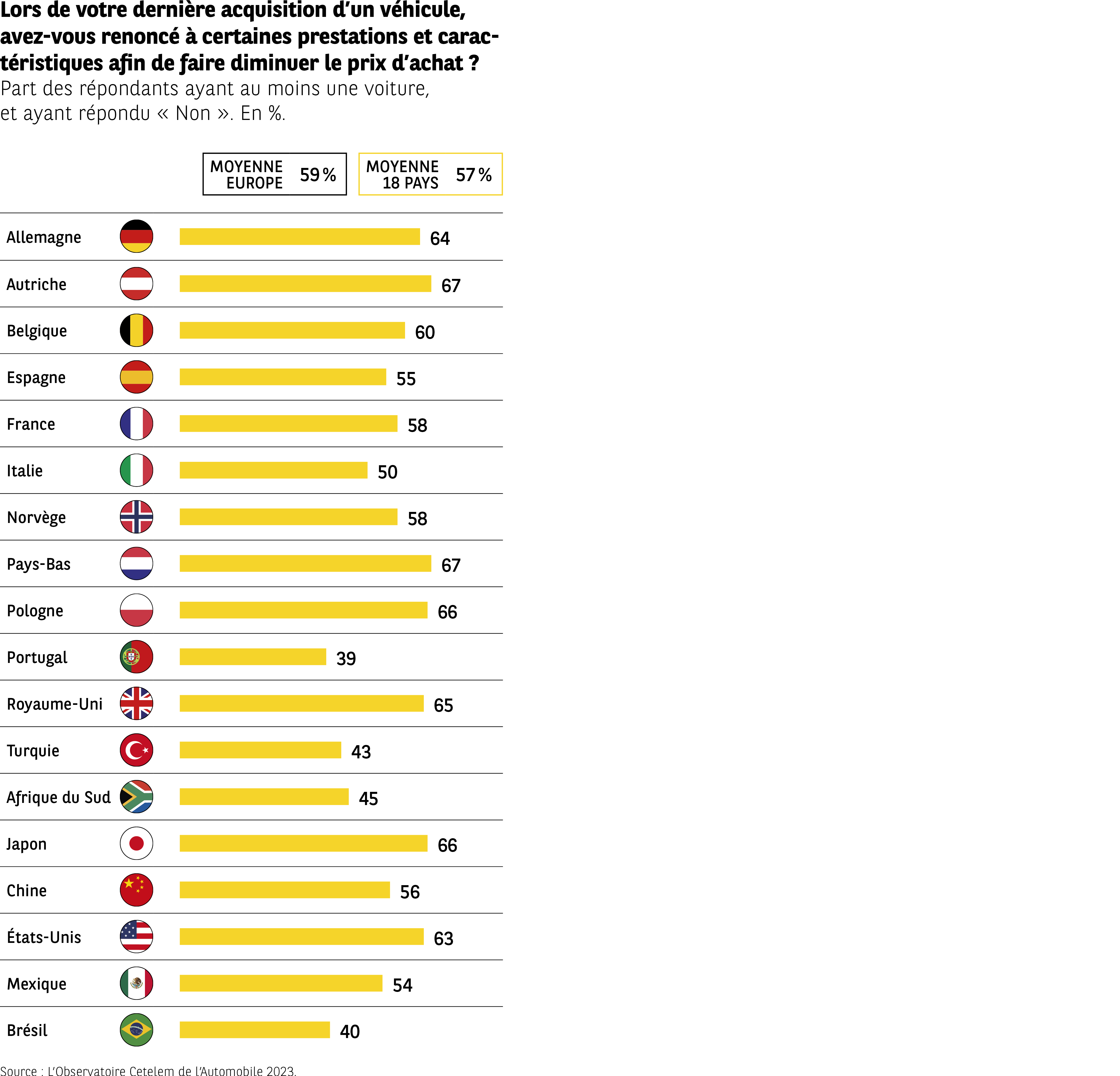 L’infographie présente la proportion de personnes ayant acheté un véhicule (neuf ou occasion) et qui n’ont pas renoncé à certaines prestations ou caractéristiques afin d’en diminuer le prix.