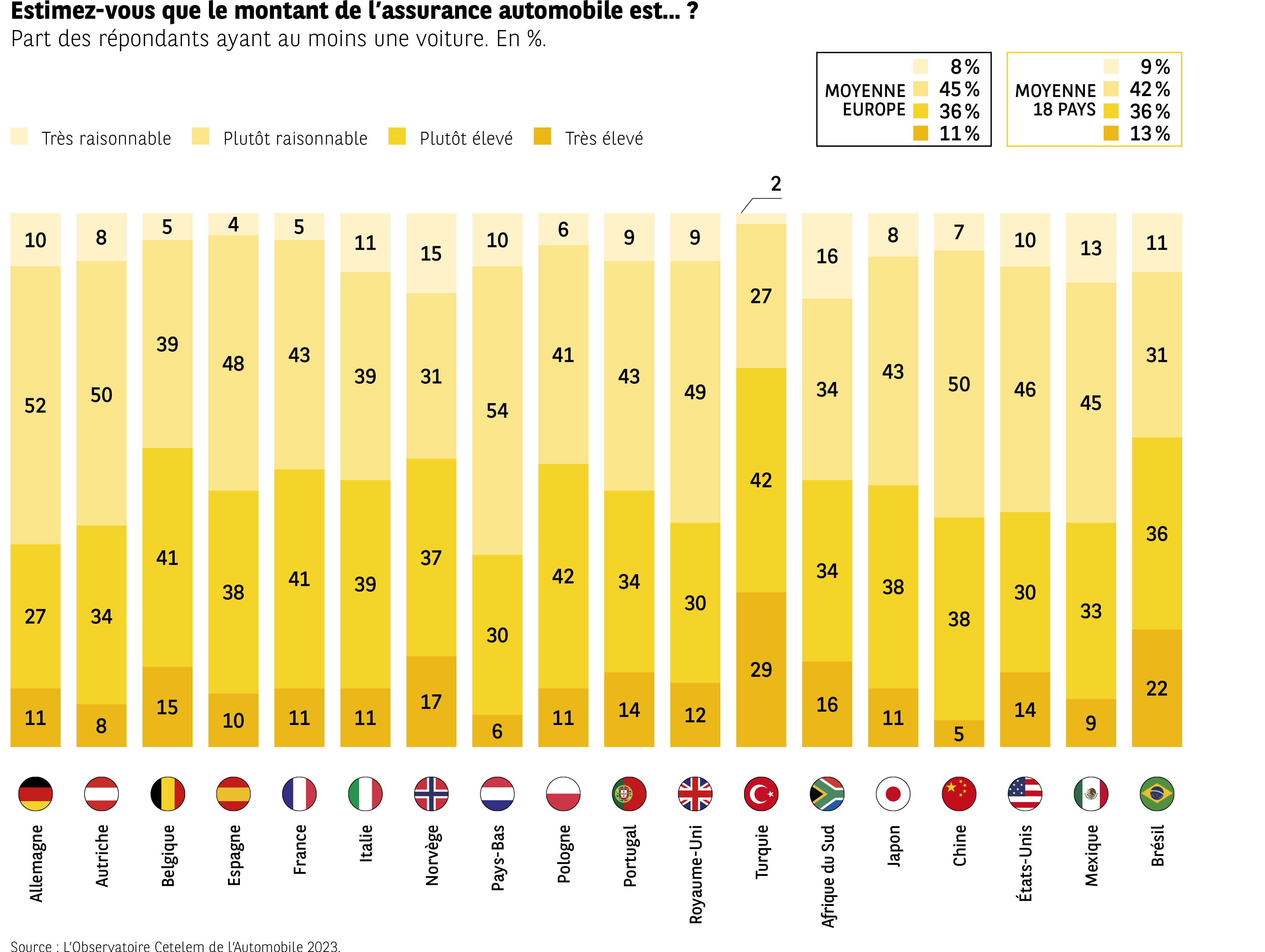 Une majorité des automobilistes est formelle, le budget global d’un véhicule est élevé s’il se réfère aux moyens dont ils disposent. 6 sur 10 partagent ce point de vue. Ils sont minoritaires dans seulement trois pays, avec les Chinois pour être les moins nombreux à pointer la cherté automobile. À l’inverse, les Turcs, pour les raisons que nous avons précédemment évoquées, mais aussi les Brésiliens, dénoncent très majoritairement ce budget élevé (Fig 12).