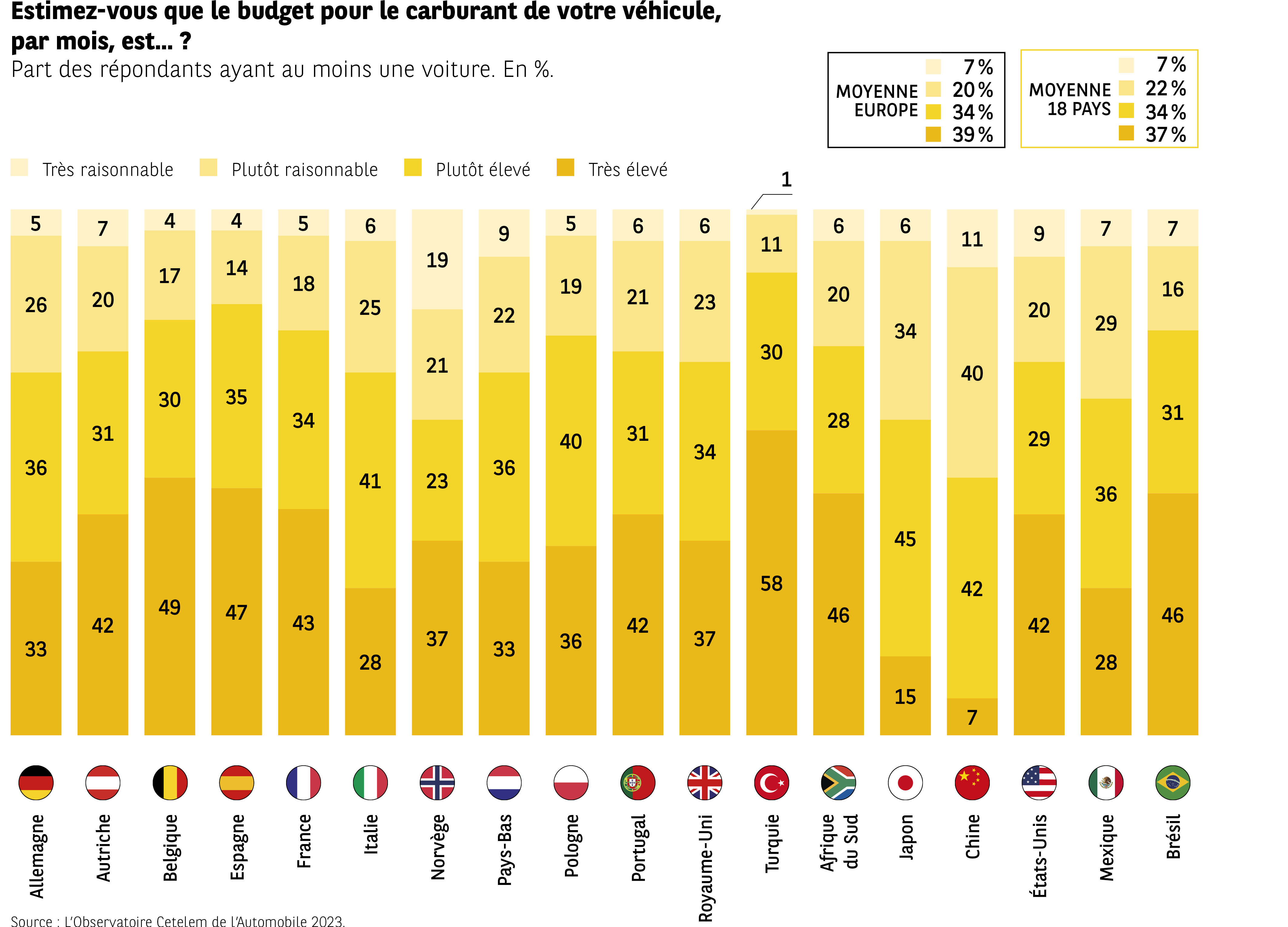 L’infographie présente une série de barres verticales empilées pour 18 pays. Chaque barre visualise la perception du budget mensuel pour le carburant, en quatre catégories :
